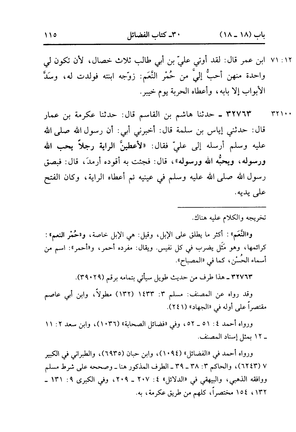32762- حَدَّثَنَا وَكِيعٌ , عَنْ هِشَامِ بْنِ سَعْدٍ , عَنْ عُمَرَ بْنِ أَسِيْدَ , عَنِ ابْنِ عُمَرَ , قَالَ : لَقَدْ أُوتِيَ عَلِيُّ بْنُ أَبِي طَالِبٍ ثَلاثَ خِصَالٍ لأَنْ تَكُونَ لِي وَاحِدَةٌ مِنْهُنَّ أَحَبُّ إلَيَّ مِنْ حُمْرِ النَّعَمِ : زَوَّجَهُ ابْنَتَهُ فَوَلَدَتْ لَهُ , وَسَدَّ الأَبْوَابَ إلاَّ بَابَهُ , وَأَعْطَاهُ الْحَرْبَةَ يَوْمَ خَيْبَرَ. (12/70).