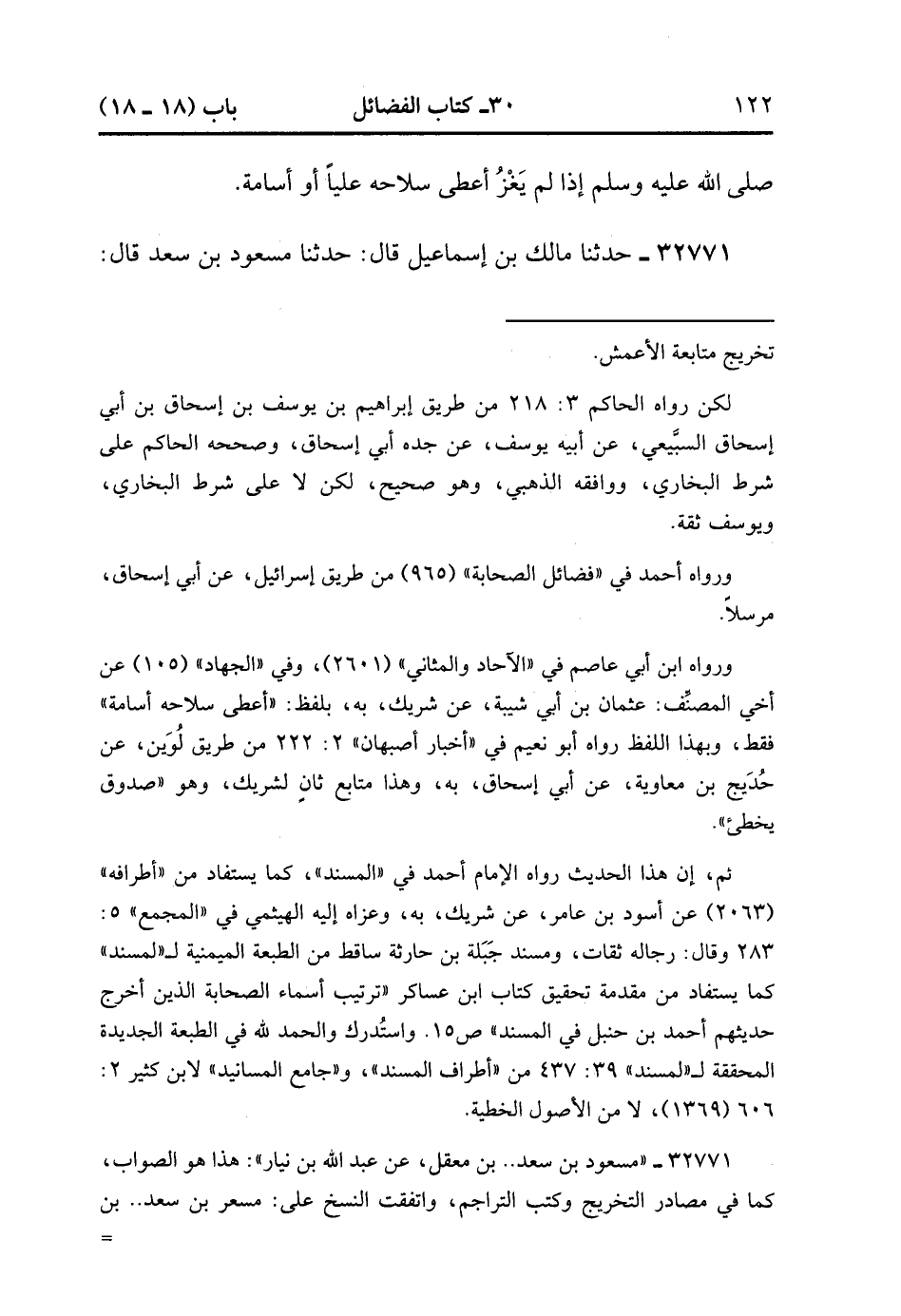 32771- حَدَّثَنَا مالك بن إسْمَاعِيلَ , قَالَ : حدَّثَنَا مَسْعُود بْنُ سَعْدٍ , قَالَ : حَدَّثَنَا مُحَمَّدُ بْنُ إِسْحَاقَ , عَنِ الْفَضْلِ بْنِ مَعْقِلٍ , عَنْ عَبْدِ اللهِ بْنِ نِيَارٍ الأَسْلَمِيِّ , عَنْ عَمْرِو بْنِ شَاسٍ , قَالَ : قَالَ لِي رَسُولُ اللهِ صَلَّى الله عَلَيْهِ وَسَلَّمَ : قَدْ آذَيْتَنِي : قَالَ : قُلْتُ : يَا رَسُولَ اللهِ , مَا أُحِبُّ أَنْ أُوذِيَكَ , قَالَ : مَنْ آذَى عَلِيًّا فَقَدْ آذَانِي. (12/75).