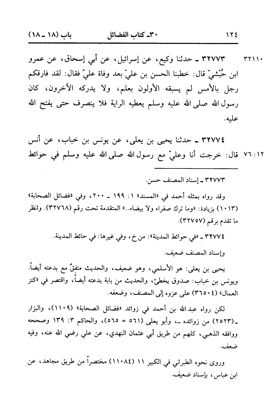 32774- حَدَّثَنَا يَحْيَى بْنُ يَعْلَى , عَنْ يُونُسَ بْنِ خَبَّابٍ , عَنْ أَنَسٍ , قَالَ : خَرَجْت أَنَا وَعَلِيٌّ مَعَ رَسُولِ اللهِ صَلَّى الله عَلَيْهِ وَسَلَّمَ , فِي حوائط الْمَدِينَةِ , فَمَرَرْنَا بِحَدِيقَةٍ , فَقَالَ عَلِيٌّ : مَا أَحْسَنَ هَذِهِ الْحَدِيقَةَ يَا رَسُولَ اللهِ , قَالَ : فَقَالَ رَسُولُ اللهِ صَلَّى الله عَلَيْهِ وَسَلَّمَ : حَدِيقَتُك فِي الْجَنَّةِ أَحْسَنُ مِنْهَا يَا عَلِي , حَتَّى مَرَّ بِسَبْعِ حَدَائِقَ , كُلُّ ذَلِكَ يَقُولُ عَلِيٌّ : مَا أَحْسَنَ هَذِهِ الْحَدِيقَةَ يَا رَسُولَ اللهِ , فَيَقُولُ : حَدِيقَتُك فِي الْجَنَّةِ أَحْسَنُ مِنْ هَذِهِ. (12/75).