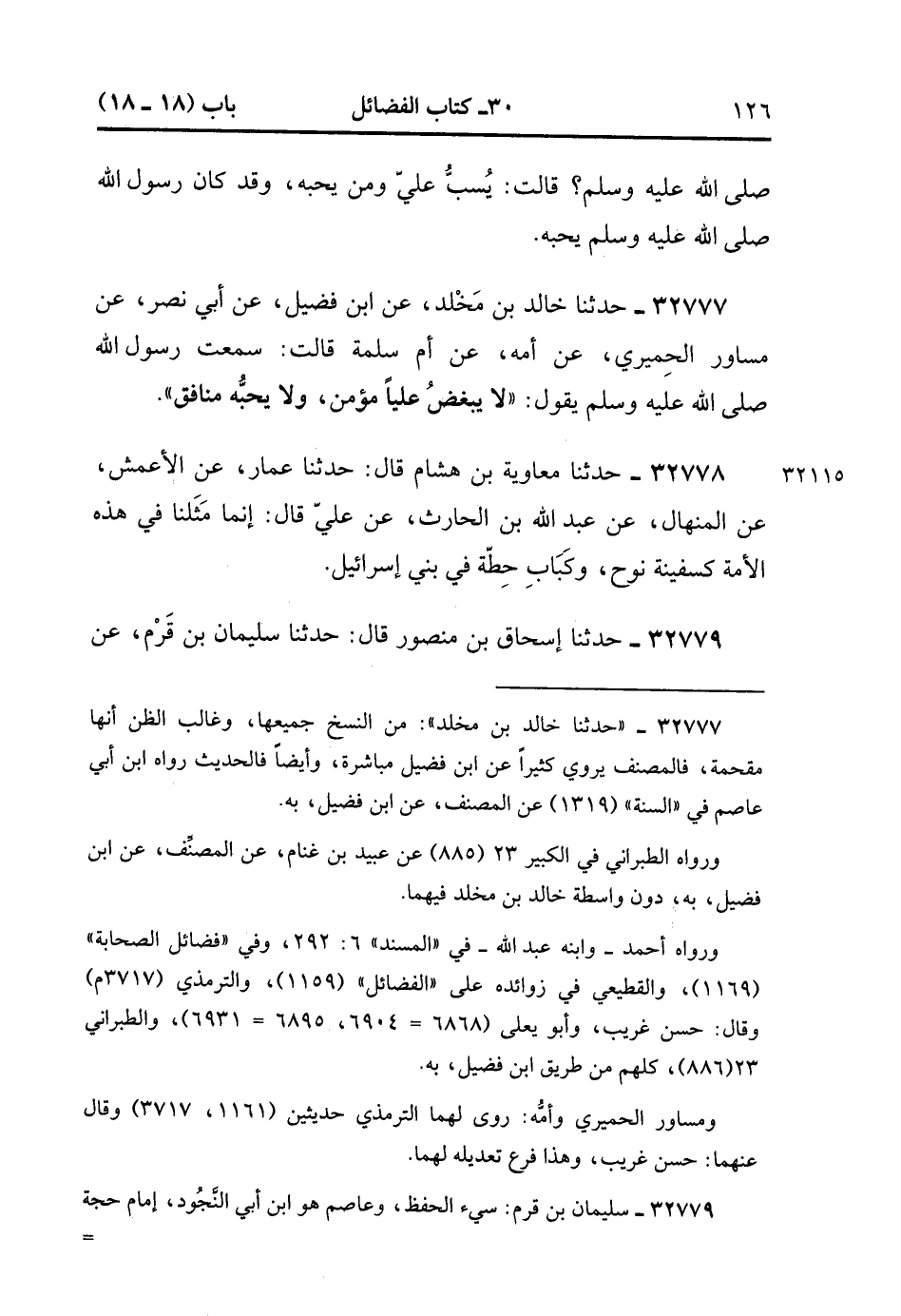 32778- حَدَّثَنَا مُعَاوِيَةُ بْنُ هِشَامٍ , قَالَ : حدَّثَنَا عَمَّارٌ , عَنِ الأَعْمَشِ , عَنِ الْمِنْهَالِ , عَنْ عَبْدِ اللهِ بْنِ الْحَارِثِ , عَنْ عَلِيٍّ , قَالَ : إنَّمَا مَثَلُنَا فِي هَذِهِ الأُمَّةِ كَسَفِينَةِ نُوحٍ وَكَبَابِ حِطَّةٍ فِي بَنِي إسْرَائِيلَ. (12/77).