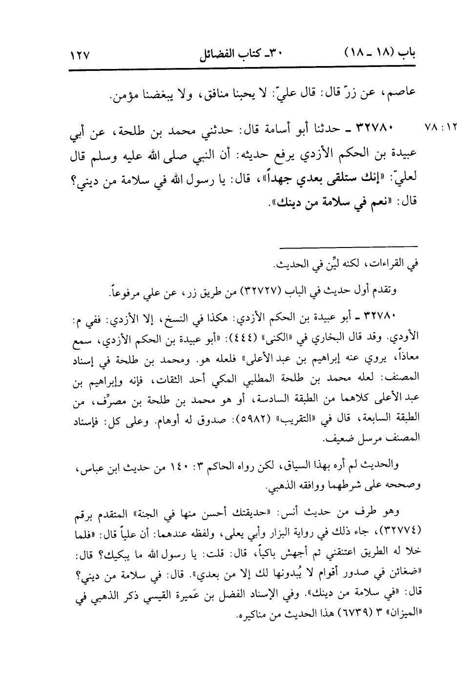 32780- حَدَّثَنَا أَبُو أُسَامَةَ , قَالَ : حدَّثَنِي مُحَمَّدُ بْنُ طَلْحَةَ , عَنْ أَبِي عُبَيْدَةَ بْنِ الْحَكَمِ الأَزْدِيِّ يَرْفَعُ حَدِيثَهُ أَنَّ النَّبِيَّ صَلَّى الله عَلَيْهِ وَسَلَّمَ قَالَ لِعَلِيٍّ : إنك سَتَلْقَى بَعْدِي جَهْدًا , قَالَ : يَا رَسُولَ اللهِ , فِي سَلامَةٍ من دِينِي , قَالَ : نَعَمْ , فِي سَلامَةٍ مِنْ دِينِكَ. (12/78).