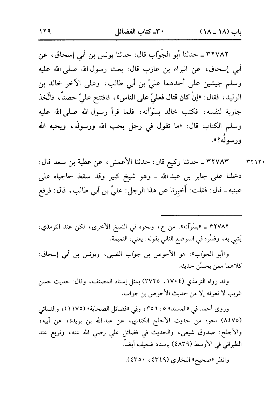 32782- حَدَّثَنَا أَبُو الْجَوَّابِ , قَالَ : حدَّثَنَا يُونُسُ بْنُ أَبِي إِسْحَاقَ , عَنِ أَبِي إِسْحَاق , عن الْبَرَاءِ بْنِ عَازِبٍ , قَالَ : بَعَثَ رَسُولُ اللهِ صَلَّى الله عَلَيْهِ وَسَلَّمَ جَيْشَيْنِ عَلَى أَحَدِهِمَا عَلِيُّ بْنُ أَبِي طَالِبٍ , وَعَلَى الآخَرِ خَالِدُ بْنُ الْوَلِيدِ , فَقَالَ : إِنْ كَانَ قِتَالٌ فَعَلِيٌّ عَلَى النَّاسِ , فَافْتَتَحَ عَلِيٌّ حِصْنًا فَاتَّخَذَ جَارِيَةً لِنَفْسِهِ , فَكَتَبَ خَالِدٌ بِسَوْأته , فَلَمَّا قَرَأَ رَسُولُ اللهِ صَلَّى الله عَلَيْهِ وَسَلَّمَ الْكِتَابَ , قَالَ : مَا تَقُولُ فِي رَجُلٍ يُحِبُّ اللَّهَ وَرَسُولَهُ وَيُحِبُّهُ اللَّهُ وَرَسُولُهُ.