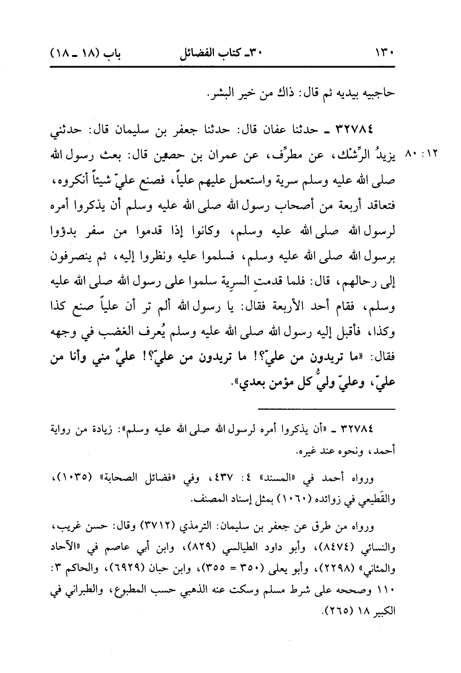 32784- حَدَّثَنَا عَفَّانُ , قَالَ : حدَّثَنَا جَعْفَرُ بْنُ سُلَيْمَانَ , قَالَ : حَدَّثَنِي يَزِيدُ الرِّشْكُ(12/79) , عَنْ مُطَرِّفٍ , عَنْ عِمْرَانَ بْنِ حُصَيْنٍ , قَالَ : بَعَثَ رَسُولُ اللهِ صَلَّى الله عَلَيْهِ وَسَلَّمَ سَرِيَّةً وَاسْتَعْمَلَ عَلَيْهِمْ عَلِيًّا , فَصَنَعَ عَلِيٌّ شَيْئًا أَنْكَرُوهُ , فَتَعَاقَدَ أَرْبَعَةٌ مِنْ أَصْحَابِ رَسُولِ اللهِ صَلَّى الله عَلَيْهِ وَسَلَّمَ أَنْ يذكروا أمرهم لرسول الله صَلَّى الله عَلَيْهِ وَسَلَّمَ وَكَانُوا إذَا قَدِمُوا مِنْ سَفَرٍ بَدَؤُوا بِرَسُولِ اللهِ صَلَّى الله عَلَيْهِ وَسَلَّمَ فَسَلَّمُوا عَلَيْهِ وَنَظَرُوا إلَيْهِ , ثُمَّ يَنْصَرِفُونَ إِلَى رِحَالِهِمْ , قَالَ : فَلَمَّا قَدِمَتِ السَّرِيَّةُ سَلَّمُوا عَلَى رَسُولِ اللهِ صَلَّى الله عَلَيْهِ وَسَلَّمَ فَقَامَ أَحَدُ الأَرْبَعَةِ , فَقَالَ : يَا رَسُولَ اللهِ , أَلَمْ تَرَ أَنَّ عَلِيًّا صَنَعَ كَذَا وَكَذَا , فَأَقْبَلَ إلَيْهِ رَسُولُ اللهِ صَلَّى الله عَلَيْهِ وَسَلَّمَ يُعْرَفُ الْغَضَبُ فِي وَجْهِهِ , فَقَالَ : مَا تُرِيدُونَ مِنْ عَلِيٍّ , مَا تُرِيدُونَ مِنْ عَلِيٍّ , عَلِيٌّ مِنِّي وَأَنَا مِنْ عَلِيٍّ , وَعَلِيٌّ وَلِيُّ كُلِّ مُؤْمِنٍ بَعْدِي. (12/80).