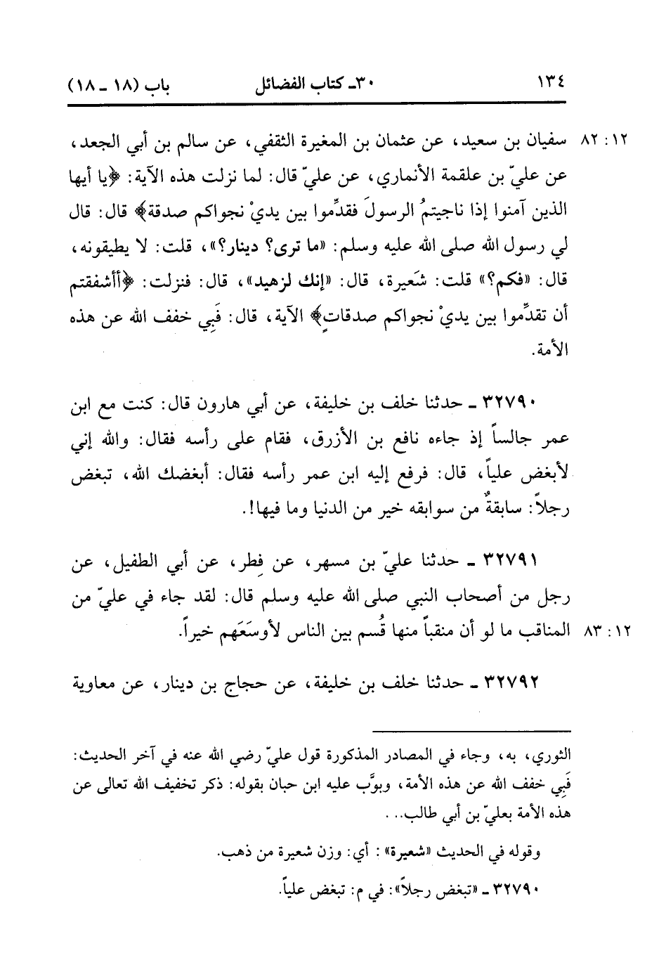 32791- حَدَّثَنَا عَلِيُّ بْنُ مُسْهِرٍ , عَنْ فِطْرٍ , عَنْ أَبِي الطُّفَيْلِ , عَنْ رَجُلٍ مِنْ أَصْحَابِ النَّبِيِّ صَلَّى الله عَلَيْهِ وَسَلَّمَ قَالَ : لَقَدْ جَاءَ فِي عَلِيٍّ مِنَ الْمَنَاقِبِ مَا لَوْ أَنَّ مَنْقَبًا مِنْهَا قُسِمَ بَيْنَ النَّاسِ لأوْسَعَهُمْ خَيْرًا. (12/82).