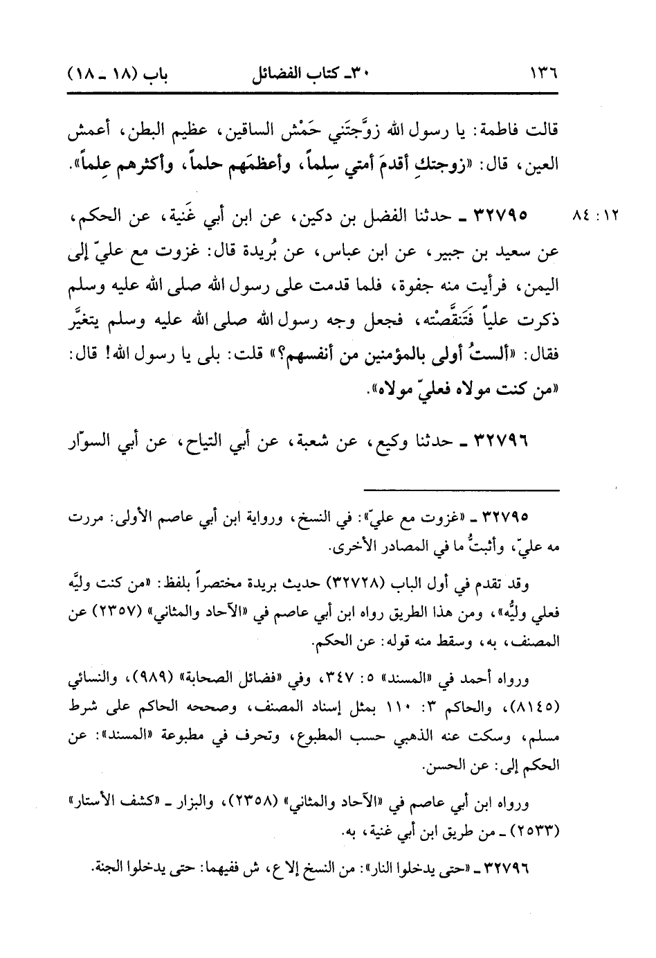 32795- حَدَّثَنَا الْفَضْلُ بْنُ دُكَيْنٍ , عَنِ ابْنِ أَبِي غَنِيَّةَ , عَنِ الْحَكَمِ , عَنْ سَعِيدِ بْنِ جُبَيْرٍ , عَنِ ابْنِ عَبَّاسٍ , عَنْ بُرَيْدَةَ , قَالَ : غزوت مَعَ عَلِيٍّ إِلَى الْيَمَنِ فَرَأَيْتُ مِنْهُ جَفْوَةً , فَلَمَّا قَدِمْت عَلَى رَسُولِ اللهِ صَلَّى الله عَلَيْهِ وَسَلَّمَ : ذَكَرْت عَلِيًّا فَتنَقَّصْتُهُ , فَجَعَلَ وَجْهُ رَسُولِ اللهِ صَلَّى الله عَلَيْهِ وَسَلَّمَ يَتَغَيَّرُ , فَقَالَ : أَلَسْت أَوْلَى بِالْمُؤْمِنِينَ مِنْ أَنْفُسِهِمْ , قُلْتُ : بَلَى يَا رَسُولَ اللهِ , قَالَ : مَنْ كُنْتُ مَوْلاهُ فَعَلِيٌّ مَوْلاهُ. (12/83).