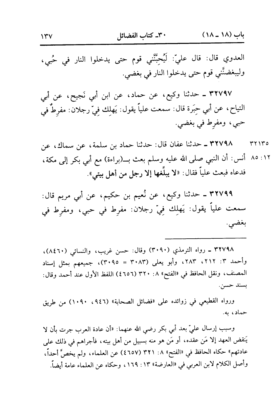 32797- حَدَّثَنَا وَكِيعٌ , عَنْ حَمَّادٍ , عَنِ ابْنِ أَبِي نَجِيحٍ , عَنْ أبي التياح عن أَبِي حبرة ، قَالَ : سَمِعْتُ عَلِيًّا يَقُولُ : يَهْلِكُ فِي رَجُلانِ : مُفْرِطٌ فِي حُبِّي وَمُفْرِطٌ فِي بُغْضِي.