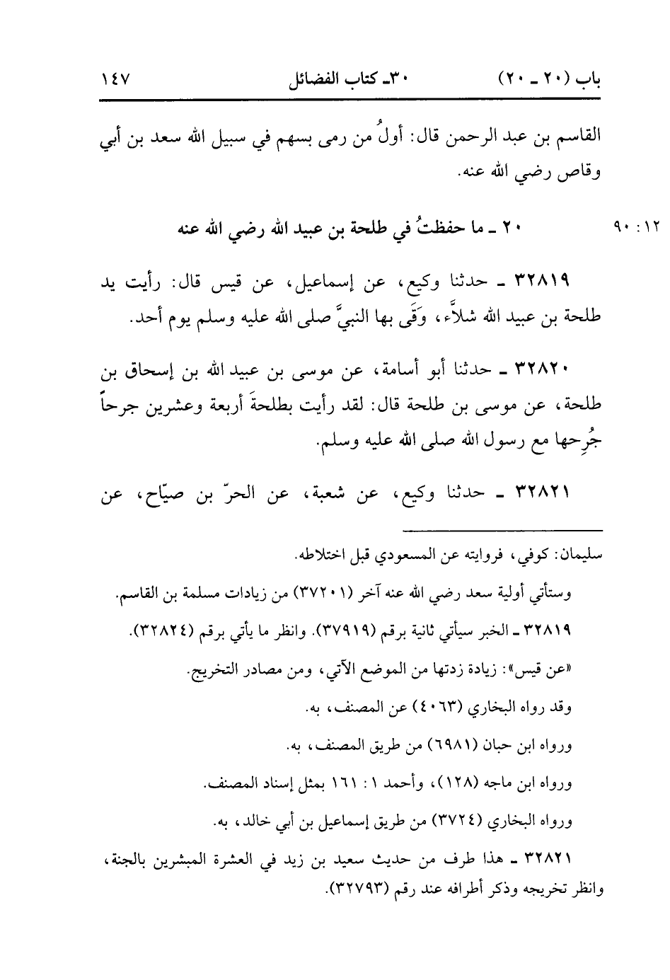 32820- حَدَّثَنَا أَبُو أُسَامَةَ , عَنْ مُوسَى بْنِ عَبْدِ اللهِ (1) بْنِ إِسْحَاقَ بْنِ طَلْحَةَ , عَنْ مُوسَى بْنِ طَلْحَةَ , قَالَ : لَقَدْ رَأَيْت بِطَلْحَةِ أَرْبَعَةً وَعِشْرِينَ جُرْحًا جُرِحَهَا مَعَ رَسُولِ اللهِ صَلَّى الله عَلَيْهِ وَسَلَّمَ. (12/90).