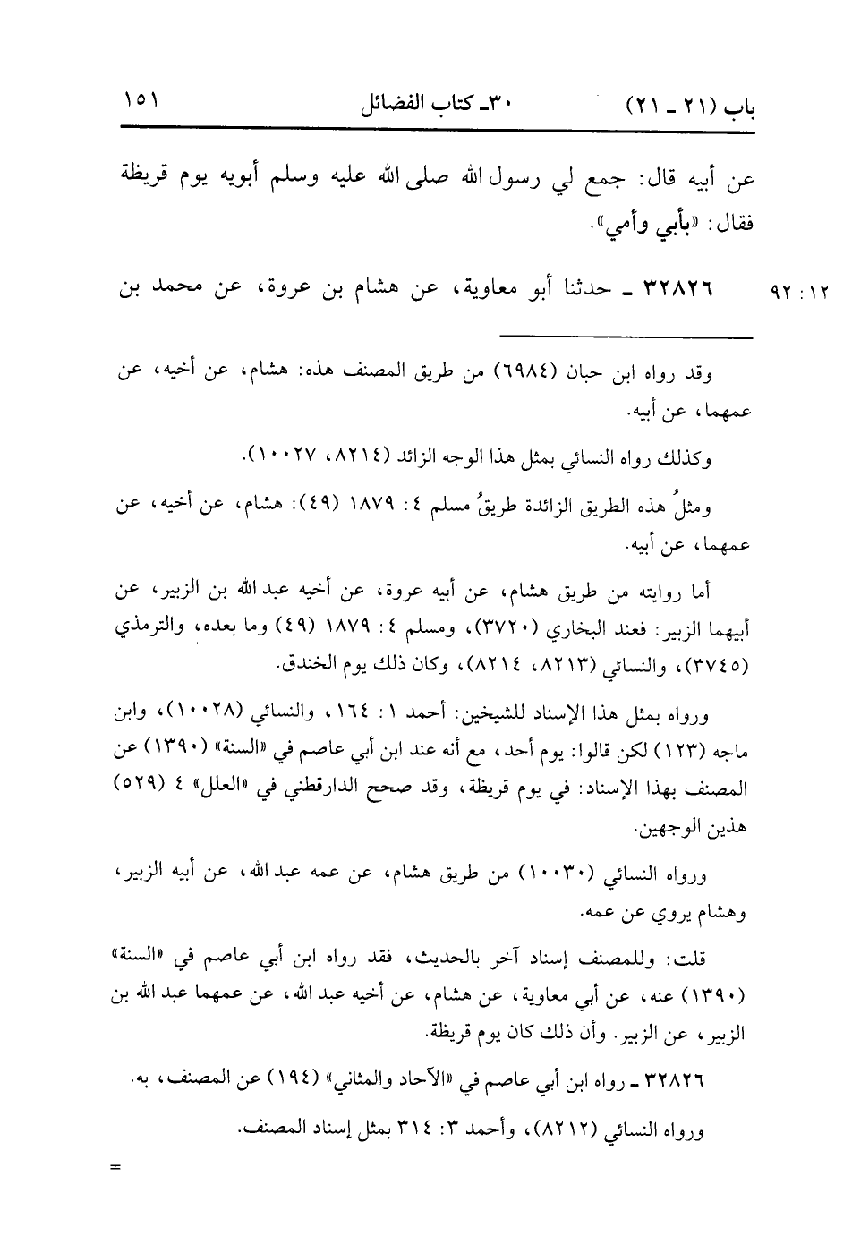32826- حَدَّثَنَا أَبُو مُعَاوِيَةَ , عَنْ هِشَامِ بْنِ عُرْوَةَ , عَنْ مُحَمَّدِ بْنِ الْمُنْكَدِرِ , عَنْ جَابِرِ بْنِ عَبْدِ اللهِ , قَالَ : قَالَ رَسُولُ اللهِ صَلَّى الله عَلَيْهِ وَسَلَّمَ : الزُّبَيْرُ ابْنُ عَمَّتِي وَحَوَارِيٌّ مِنْ أُمَّتِي. (12/92).