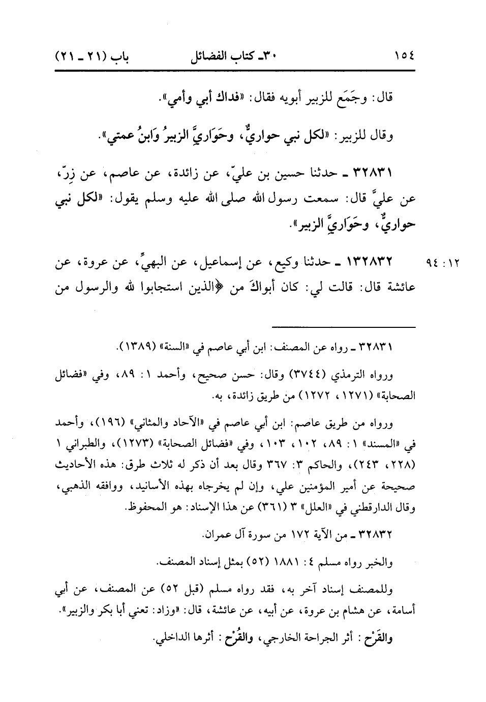 32831- حَدَّثَنَا حُسَيْنُ بْنُ عَلِيٍّ , عَنْ زَائِدَةَ , عَنْ عَاصِمٍ , عَنْ زِرٍّ , عَنْ عَلِيٍّ ، قَالَ : سَمِعْتُ رَسُولَ اللهِ صَلَّى الله عَلَيْهِ وَسَلَّمَ يَقُولُ : لِكُلِّ نَبِيٍّ حَوَارِيٌّ ، وَحَوَارِيَّ الزُّبَيْرُ. (12/93).