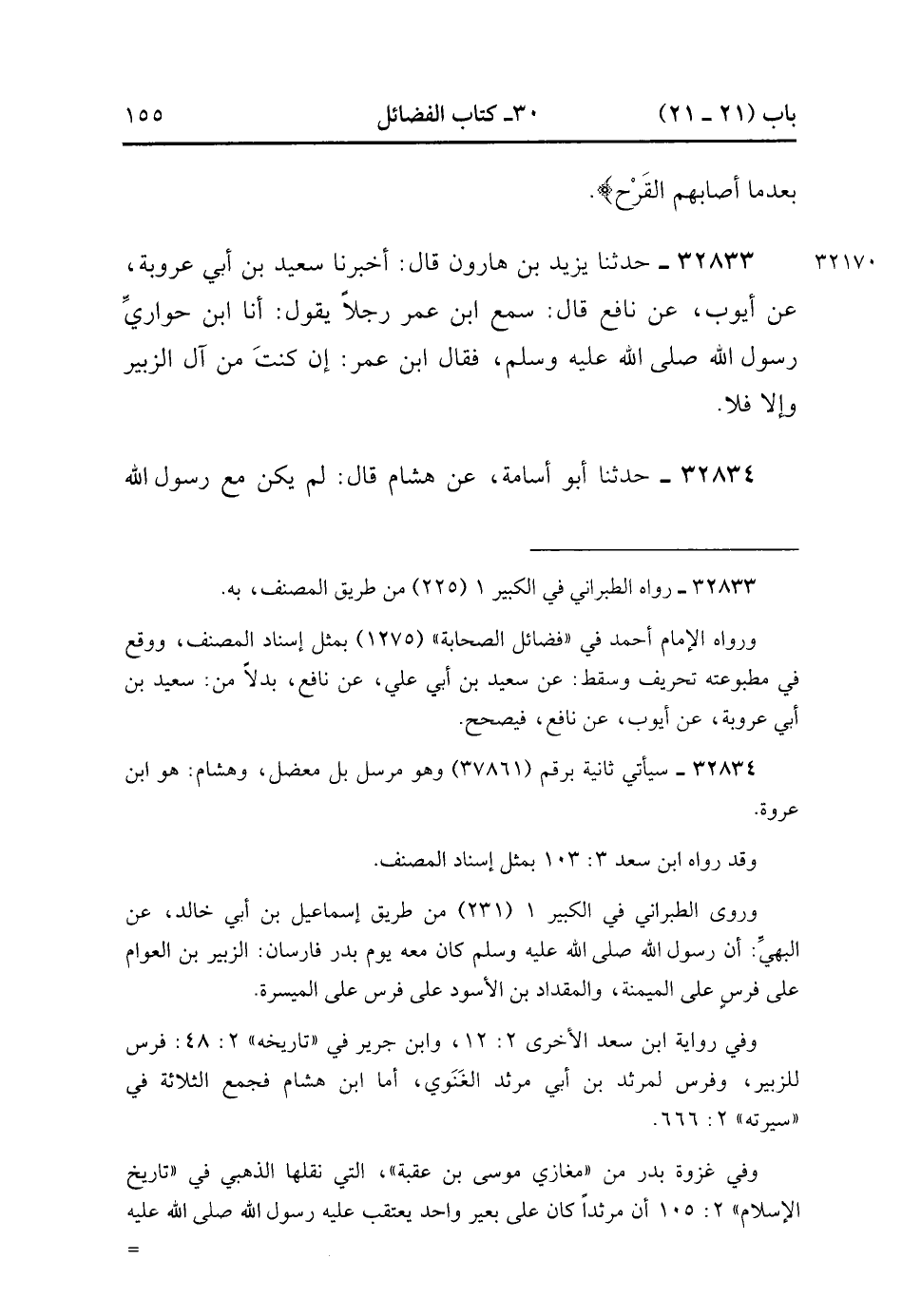 32834- حَدَّثَنَا أَبُو أُسَامَةَ , عَنْ هِشَامٍ , قَالَ : لَمْ يَكُنْ مَعَ رَسُولِ اللهِ صَلَّى الله عَلَيْهِ وَسَلَّمَ يَوْمَ بَدْرٍ غَيْرُ فَرَسَيْنِ أَحَدُهُمَا عَلَيْهِ الزُّبَيْرُ. (12/94).