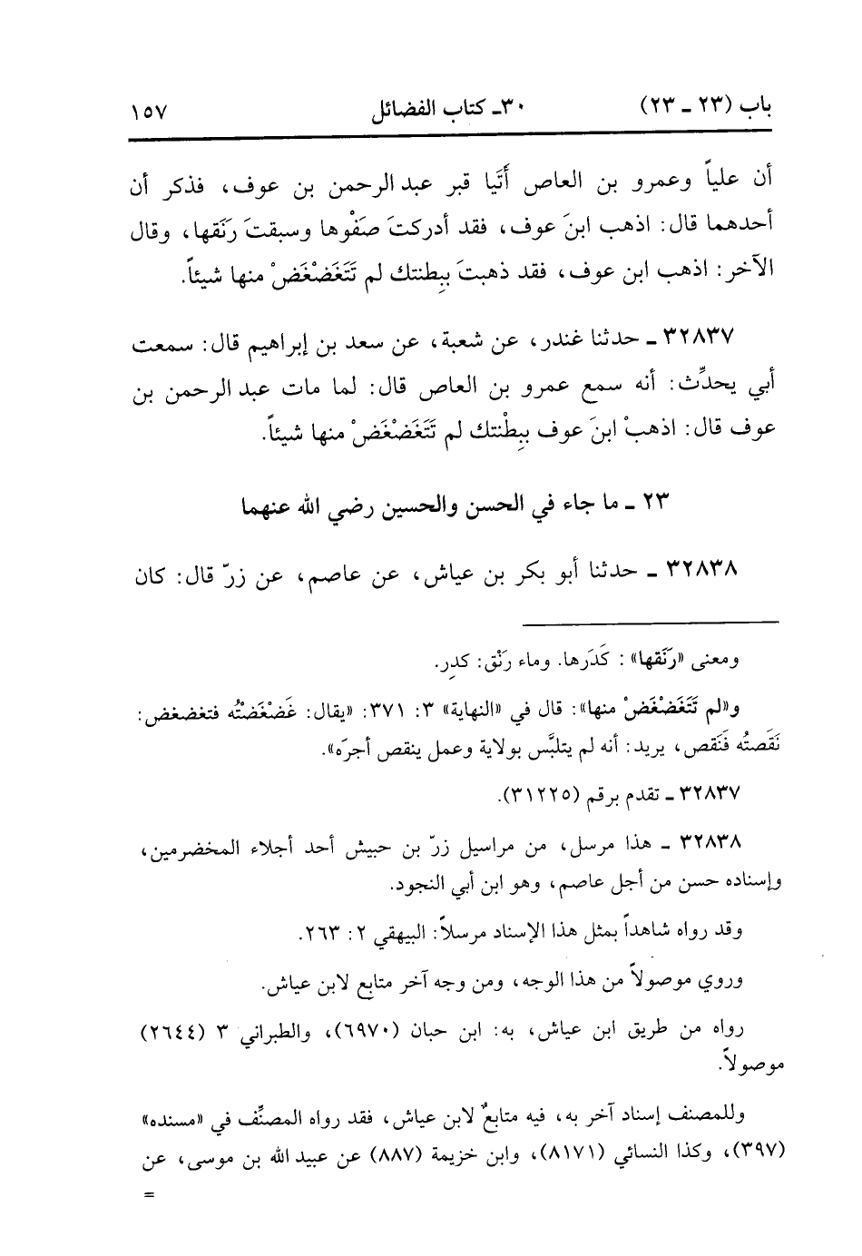 32838- حَدَّثَنَا أَبُو بَكْرِ بْنُ عَيَّاشٍ , عَنْ عَاصِمٍ , عَنْ زِرٍّ , قَالَ : كَانَ الْحَسَنُ وَالْحُسَيْنُ يَثِبَانِ عَلَى ظَهْرِ رَسُولِ اللهِ صَلَّى الله عَلَيْهِ وَسَلَّمَ وَهُوَ يُصَلِّي , فَجَعَلَ النَّاسُ يُنَحُّونَهُمَا , فَقَالَ النَّبِيُّ صَلَّى الله عَلَيْهِ وَسَلَّمَ : دَعُوهُمَا بِأَبِي هُمَا وَأُمِّي , مَنْ أَحَبَّنِي فَلْيُحِبَّ هَذَيْنِ. (12/95).