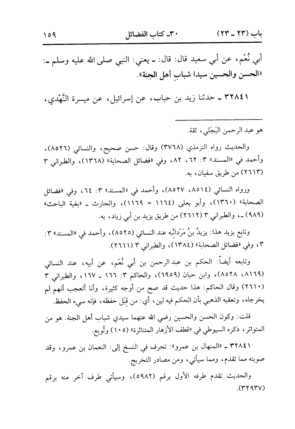 32841- حَدَّثَنَا زَيْدُ بْنُ حُبَابٍ , عَنْ إسْرَائِيلَ , عَنْ مَيْسَرَةَ النَّهْدِيِّ , عَنِ الْمِنْهَالِ بْنِ عَمْرٍو , عَنْ زِرِّ بْنِ حُبَيْشٍ , عَنْ حُذَيْفَةَ , قَالَ : أَتَيْتُ النَّبِيَّ صَلَّى الله عَلَيْهِ وَسَلَّمَ فَصَلَّيْت مَعَهُ الْمَغْرِبَ , ثُمَّ قَامَ يُصَلِّي حَتَّى صَلَّى الْعِشَاءَ , ثُمَّ خَرَجَ فَاتَّبَعْتُهُ , فَقَالَ : مَلَكٌ عَرَضَ لِي اسْتَأْذَنَ رَبَّهُ أَنْ يُسَلِّمَ عَلَيَّ وَيُبَشِّرَنِي أَنَّ الْحَسَنَ وَالْحُسَيْنَ سَيِّدَا شَبَابِ أَهْلِ الْجَنَّةِ. (12/96).