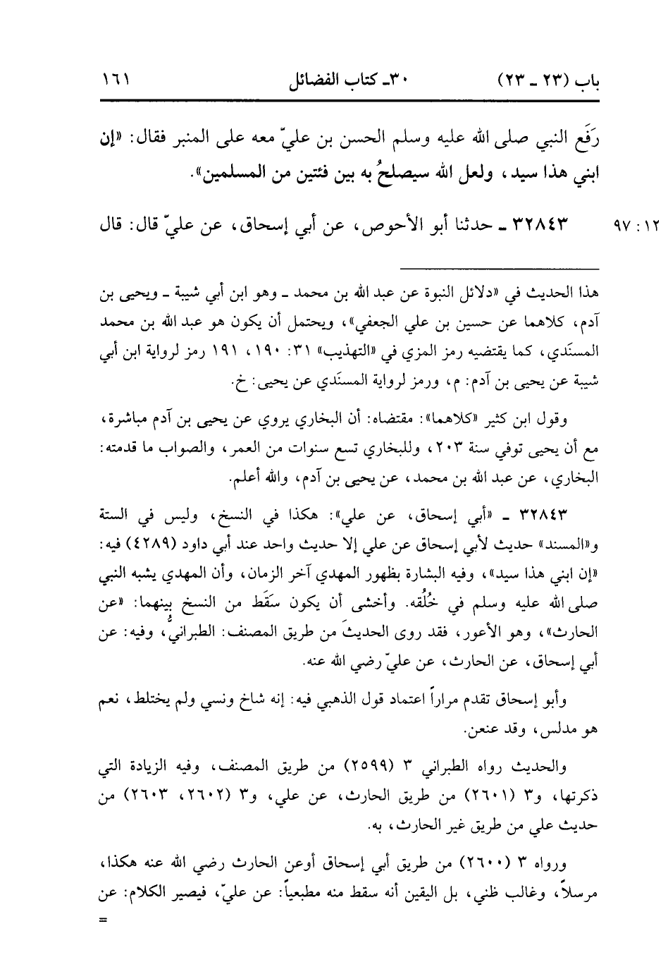 32843- حَدَّثَنَا أَبُو الأَحْوَصِِ , عَنْ أَبِي إِسْحَاقَ , عَنْ عَلِيٍّ , قَالَ : قَالَ رَسُولُ اللهِ صَلَّى الله عَلَيْهِ وَسَلَّمَ : الْحَسَنُ وَالْحُسَيْنُ سَيِّدَا شَبَابِ أَهْلِ الْجَنَّةِ. (12/97).