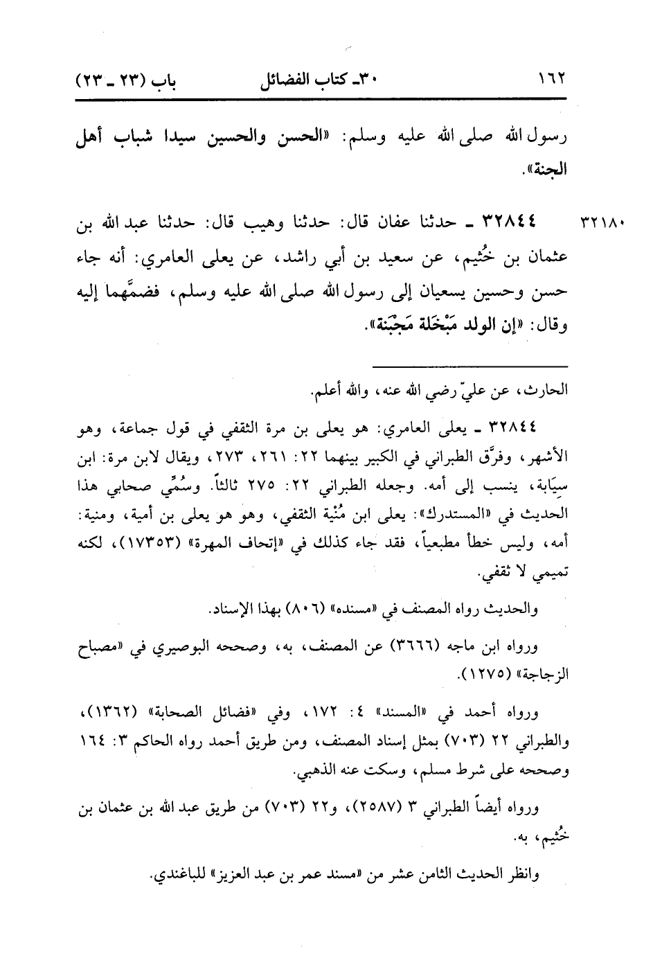 32844- حَدَّثَنَا عَفَّانُ , قَالَ : حدَّثَنَا وُهَيْبٌ , قَالَ : حَدَّثَنَا عَبْدُ اللهِ بْنُ عُثْمَانَ بْنِ خُثَيْمٍ , عَنْ سَعِيدِ بْنِ أَبِي رَاشِدٍ , عَنْ يَعْلَى الْعَامِرِيِّ ؛ أَنَّهُ جَاءَ حَسَنٌ وَحُسَيْنٌ يَسْعَيَانِ إِلَى رَسُولِ اللهِ صَلَّى الله عَلَيْهِ وَسَلَّمَ فَضَمَّهُمَا إلَيْهِ , وَقَالَ : إنَّ الْوَلَدَ مَبْخَلَةٌ مَجْبَنَةٌ. (12/97).