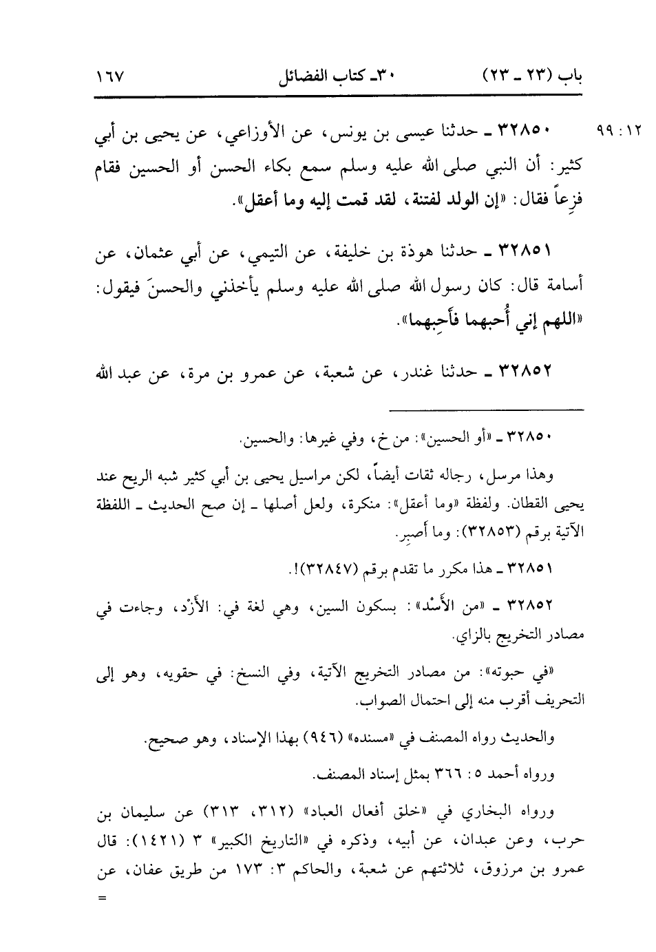 32851- حَدَّثَنَا هَوْذَةُ بْنُ خَلِيفَةَ , عَنِ التَّيْمِيِّ , عَنْ أَبِي عُثْمَانَ , عَنْ أُسَامَةَ قَالَ : كَانَ رَسُولُ اللهِ صَلَّى الله عَلَيْهِ وَسَلَّمَ يَأْخُذُنِي وَالْحَسَنَ فَيَقُولُ : اللَّهُمَّ إنِّي أُحِبُّهُمَا فَأَحِبَّهُمَا.