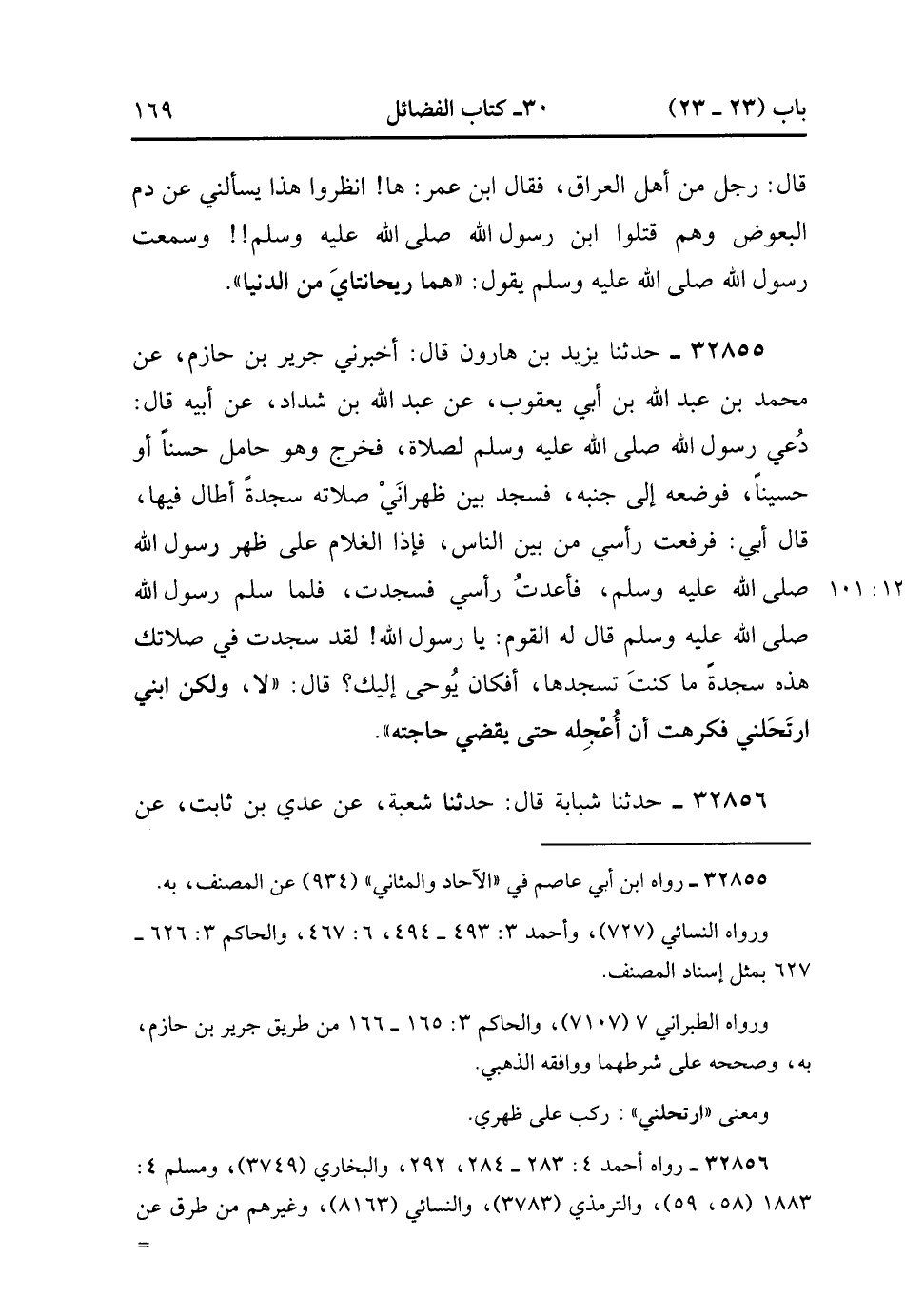 32855- حَدَّثَنَا يَزِيدُ بْنُ هَارُونَ , قَالَ : أَخْبَرَنِي جَرِيرُ بْنُ حَازِمٍ , عَنْ مُحَمَّدِ بْنِ عَبْدِ اللهِ بْنِ أَبِي يَعْقُوبَ , عَنْ عَبْدِ اللهِ بْنِ شَدَّادٍ , عَنْ أَبِيهِ , قَالَ : دُعِيَ رَسُولُ اللهِ صَلَّى الله عَلَيْهِ وَسَلَّمَ لِصَلاةٍ , فَخَرَجَ وَهُوَ حَامِلٌ حَسَنًا , أَوْ حُسَيْنًا فَوَضَعَهُ إِلَى جَنْبِهِ فَسَجَدَ بَيْنَ ظَهْرَانَيْ صَلاتِهِ سَجْدَةً أَطَالَ فِيهَا , قَالَ أَبِي : فَرَفَعْت رَأْسِي مِنْ بَيْنِ النَّاسِ فَإِذَا الْغُلامُ عَلَى ظَهْرِ رَسُولِ اللهِ صَلَّى الله عَلَيْهِ وَسَلَّمَ فَأَعَدْت رَأْسِي فَسَجَدْت , فَلَمَّا سَلَّمَ رَسُولُ اللهِ صَلَّى الله عَلَيْهِ وَسَلَّمَ قَالَ لَهُ الْقَوْمُ : يَا رَسُولَ اللهِ لَقَدْ سَجَدْت فِي صَلاتِكَ هَذِهِ سَجْدَةً مَا كُنْت تَسْجُدُهَا , أَفَكَانَ يُوحَى إلَيْك ؟ قَالَ : لاَ وَلَكِنَّ ابْنِي ارْتَحَلَنِي فَكَرِهْت أَنْ أُعَجِّلَهُ حَتَّى يَقْضِيَ حَاجَتَهُ. (12/100).