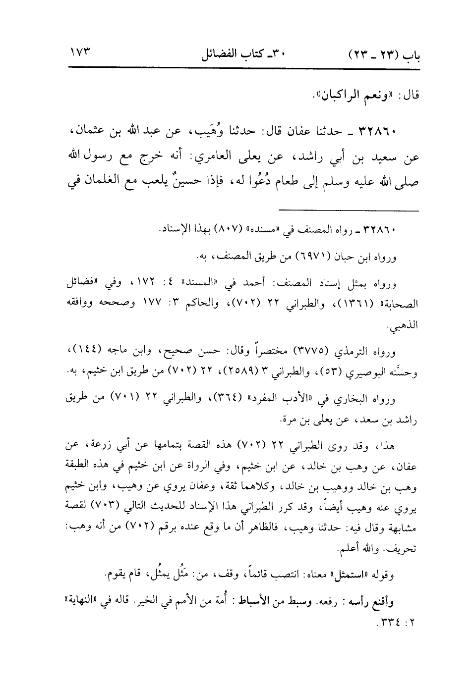 32860- حَدَّثَنَا عَفَّانُ , قَالَ : حدَّثَنَا وُهَيْبٌ , عَنْ عَبْدِ اللهِ بْنِ عُثْمَانَ , عَنْ سَعِيدِ بْنِ أَبِي رَاشِدٍ , عَنْ يَعْلَى الْعَامِرِيِّ أَنَّهُ خَرَجَ مَعَ رَسُولِ اللهِ صَلَّى الله عَلَيْهِ وَسَلَّمَ : إِلَى طَعَامٍ دَعُوا لَهُ , فَإِذَا حُسَيْنٌ يَلْعَبُ مَعَ الْغِلْمَانِ فِي الطَّرِيقِ فاستمثل أَمَامَ الْقَوْمِ , ثُمَّ بَسَطَ يَدَهُ وَطَفِقَ الصَّبِيُّ يَفِرُّ هَاهُنَا مَرَّةً وَهَاهُنَا , وَجَعَلَ رَسُولُ اللهِ صَلَّى الله عَلَيْهِ وَسَلَّمَ يُضَاحِكُهُ حَتَّى أَخَذَهُ رَسُولُ اللهِ صَلَّى الله عَلَيْهِ وَسَلَّمَ فَجَعَلَ إحْدَى يَدَيْهِ تَحْتَ ذَقْنِهِ وَالأُخْرَى تَحْتَ قَفَاهُ , ثُمَّ أَقْنَعَ رَأْسَهُ رَسُولُ اللهِ صَلَّى الله عَلَيْهِ وَسَلَّمَ فَوَضَعَ فَاهُ عَلَى فِيهِ فَقَبَّلَهُ , فَقَالَ : حُسَيْنٌ مِنِّي وَأَنَا مِنْ حُسَيْنٍ , أَحَبَّ اللَّهُ مَنْ أَحَبَّ حُسَيْنًا , حُسَيْنٌ سِبْطٌ مِنَ الأَسْبَاطِ. (12/102).