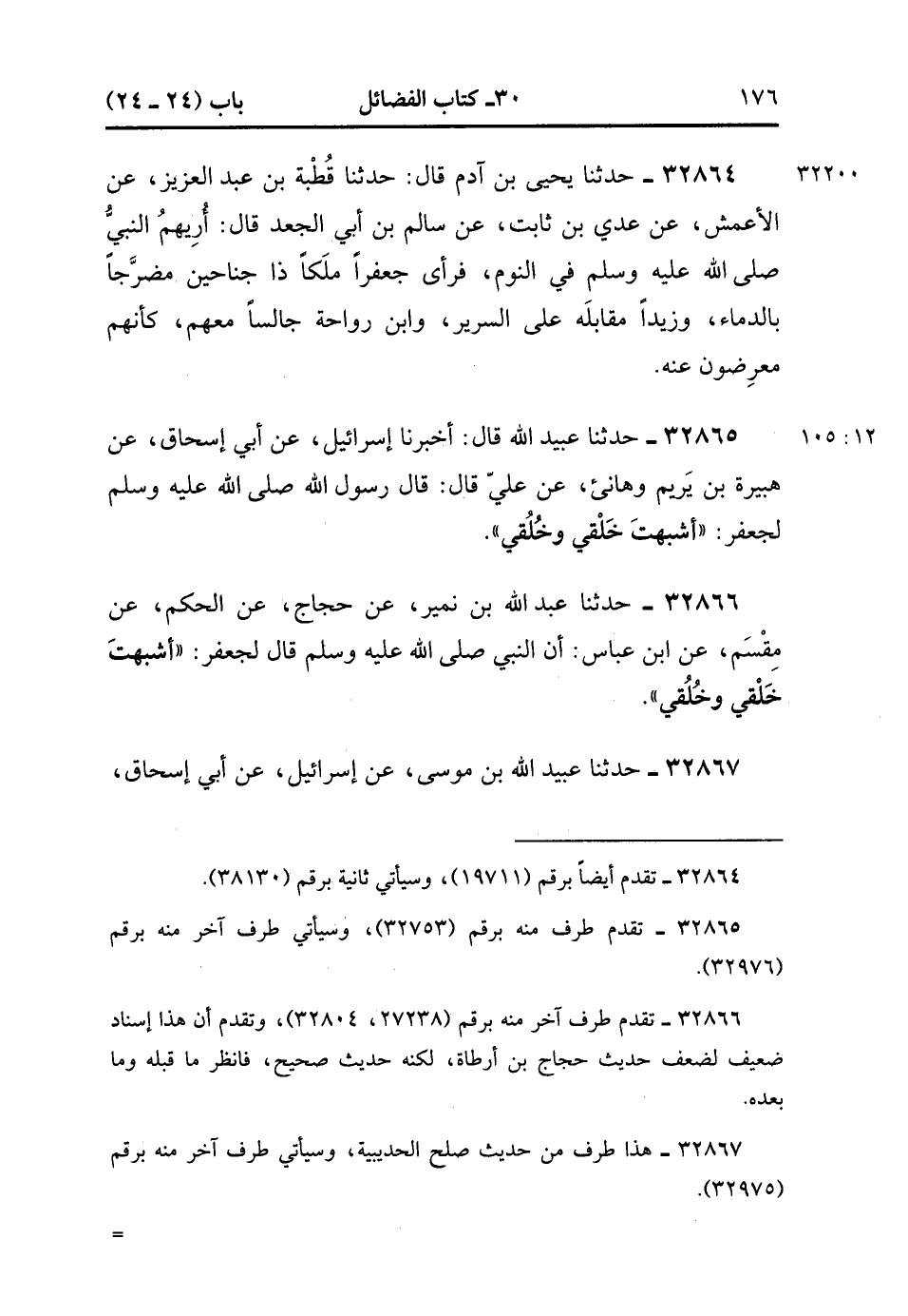 32866- حَدَّثَنَا عَبْد الله بن نُمَيْر , عَنْ حَجَّاجٍ , عَنِ الْحَكَمِ , عَنْ مِقْسَمٍ , عَنِ ابْنِ عَبَّاسٍ أَنَّ النَّبِيَّ صَلَّى الله عَلَيْهِ وَسَلَّمَ قَالَ لِجَعْفَرٍ : أَشْبَهْت خَلْقِي وَخُلُقِي. (12/105).