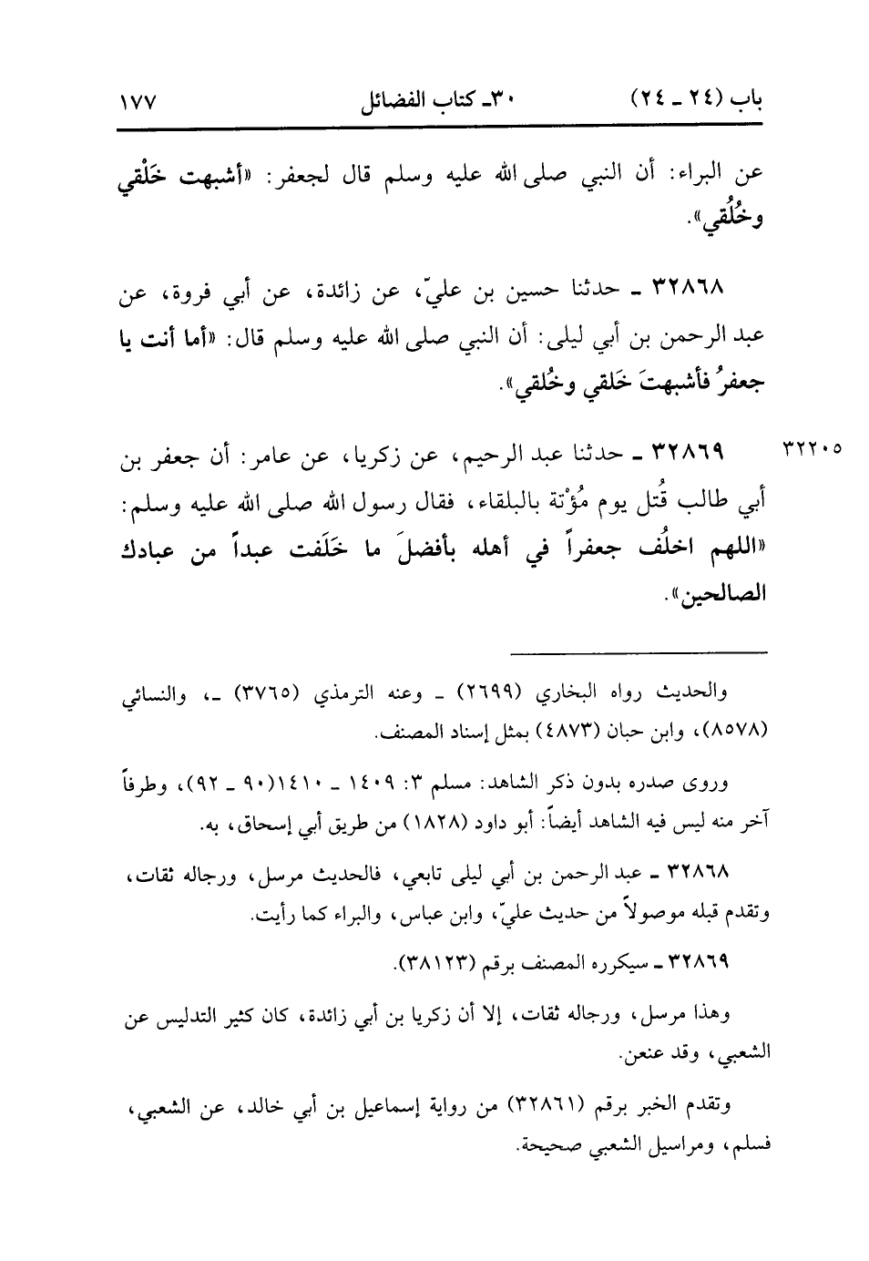 32867- حَدَّثَنَا عُبَيْدُ اللهِ بْنُ مُوسَى , عَنْ إسْرَائِيلَ , عَنْ أَبِي إِسْحَاقَ , عَنِ الْبَرَاءِ أَنَّ النَّبِيَّ صَلَّى الله عَلَيْهِ وَسَلَّمَ قَالَ لِجَعْفَرٍ : أَشْبَهْت خَلْقِي وَخُلُقِي.
