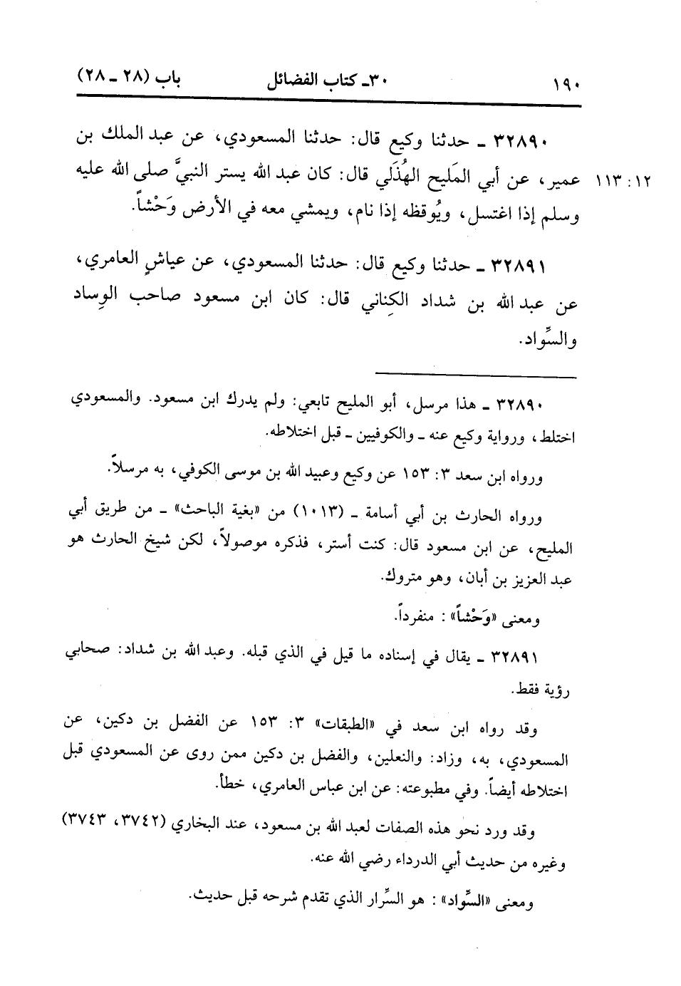 32890- حَدَّثَنَا وَكِيعٌ , قَالَ : حدَّثَنَا الْمَسْعُودِيُّ , عَنْ عَبْدِ الْمَلِكِ بْنِ عُمَيْرٍ , عَنْ أَبِي الْمَلِيحِ الْهُذَلِيِّ , قَالَ : كَانَ عَبْدُ اللهِ يَسْتُرُ النَّبِيَّ صَلَّى الله عَلَيْهِ وَسَلَّمَ إذَا اغْتَسَلَ , وَيُوقِظُهُ إذَا نَامَ , وَيَمْشِي مَعَهُ فِي الأَرْضِ وَحْشًا. (12/112).