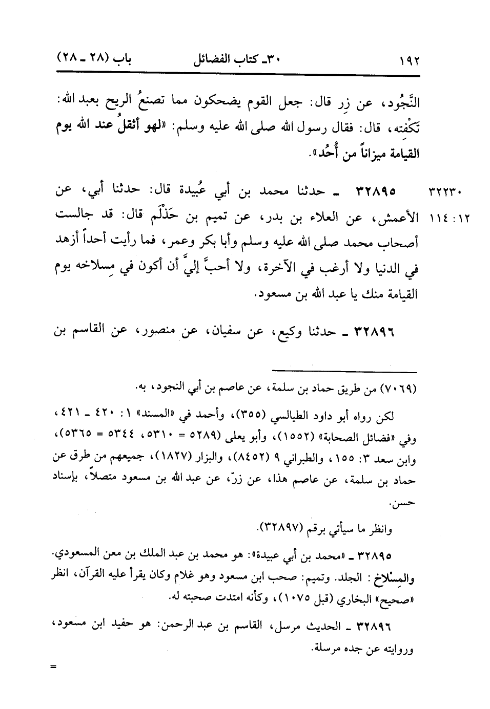 32895- حَدَّثَنَا مُحَمَّدُ بْنُ أَبِي عُبَيْدَةَ , قَالَ : حدَّثَنَا أَبِي , عَنِ الأَعْمَشِ , عَنِ الْعَلاءِ بْنِ بَدْرٍ , عَنْ تَمِيمِ بْنِ حَذْلَمَ , قَالَ : قَدْ جَالَسْت أَصْحَابَ مُحَمَّدٍ صَلَّى الله عَلَيْهِ وَسَلَّمَ وَأَبَا بَكْرٍ وَعُمَرَ فَمَا رَأَيْت أحدا أَزْهَدَ فِي الدُّنْيَا , وَلا أَرْغَبَ فِي الآخِرَةِ , وَلا أَحَبَّ إلَيَّ أَنْ أَكُونَ فِي مِسْلاَخِهِ يَوْمَ الْقِيَامَةِ مِنْك يَا عَبْدَ اللهِ بْنَ مَسْعُودٍ. (12/114).