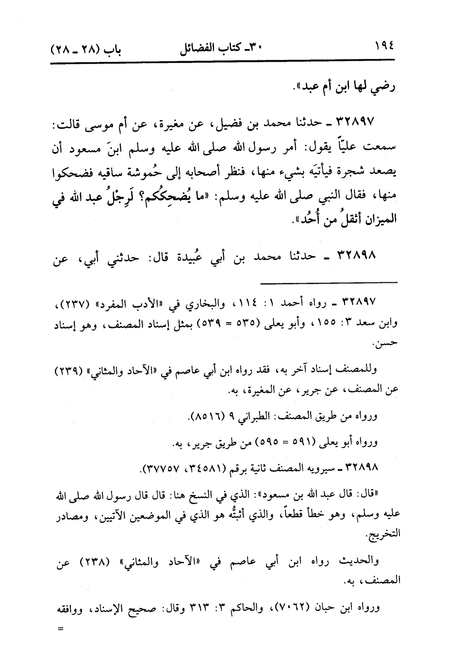 32897- حَدَّثَنَا مُحَمَّدُ بْنُ فُضَيْلٍ , عَنْ مُغِيرَةَ , عَنْ أُمِّ مُوسَى , قَالَتْ : سَمِعْت عَلِيًّا يَقُولُ : أَمَرَ رَسُولُ اللهِ صَلَّى الله عَلَيْهِ وَسَلَّمَ ابْنَ مَسْعُودٍ أَنْ يَصْعَدَ شَجَرَةً فَيَأْتِيَهُ بِشَيْءٍ مِنْهَا , فَنَظَرَ أَصْحَابُهُ إِلَى حُمُوشَةِ سَاقَيْهِ فَضَحِكُوا مِنْهَا , فَقَالَ النَّبِيُّ صَلَّى الله عَلَيْهِ وَسَلَّمَ : مَا يُضْحِكُكُمْ لَرِجْلُ عَبْدِ اللهِ فِي الْمِيزَانِ أَثْقَلُ مِنْ أُحُدٍ.