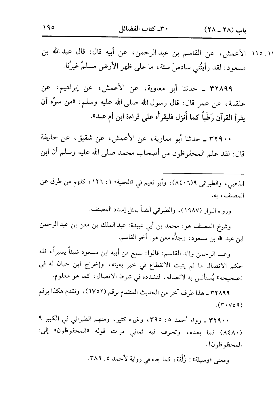 32900- حَدَّثَنَا أَبُو مُعَاوِيَةَ , عَنِ الأَعْمَشِ , عَنْ شَقِيقٍ , عَنْ حُذَيْفَةَ , قَالَ : لَقَدْ عَلِمَ الْمَحْفُوظُونَ مِنْ أَصْحَابِ مُحَمَّدٍ صَلَّى الله عَلَيْهِ وَسَلَّمَ أَنَّ ابْنَ مَسْعُودٍ أَقْرَبُهُمْ عِنْدَ اللهِ وَسِيلَةً يَوْمَ الْقِيَامَةِ. (12/115).