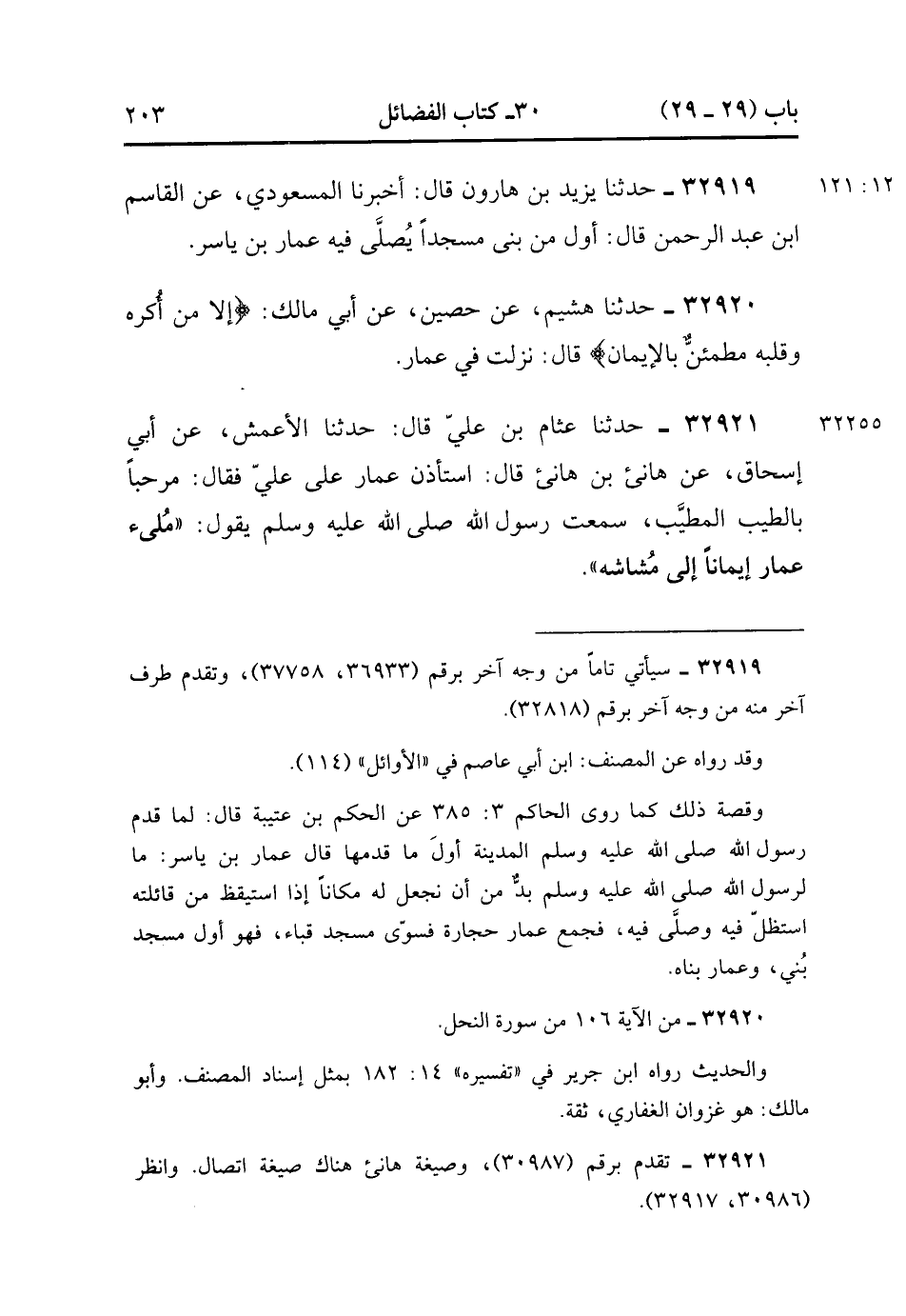 32921- حَدَّثَنَا عَثَّامُ بْنُ عَلِيٍّ , قَالَ : حدَّثَنَا الأَعْمَشُ , عَنْ أَبِي إِسْحَاقَ , عَنْ هَانِئِ بْنِ هَانِئٍ , قَالَ : اسْتَأْذَنَ عَمَّارٌ عَلَى عَلِيٍّ , فَقَالَ : مَرْحَبًا بِالطَّيِّبِ الْمُطَيَّبِ سَمِعْتُ رَسُولَ اللهِ صَلَّى الله عَلَيْهِ وَسَلَّمَ يَقُولُ : مُلِئَ عَمَّارٌ إيمَانًا إِلَى مُشَاشِهِ. (12/121).