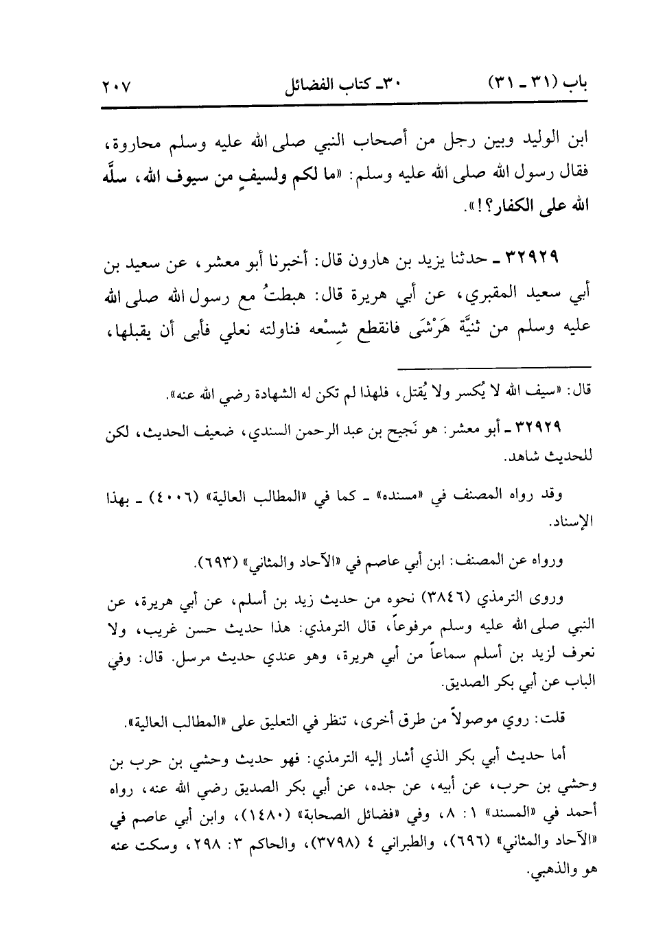 32929- حَدَّثَنَا يَزِيدُ بْنُ هَارُونَ , قَالَ : أَخْبَرَنَا أَبُو مَعْشَرٍ , عَنْ سَعِيدِ بْنِ أَبِي سَعِيدٍ الْمَقْبُرِيِّ , عَنْ أَبِي هُرَيْرَةَ , قَالَ : هَبَطْتُ مَعَ رَسُولِ اللهِ صَلَّى الله عَلَيْهِ وَسَلَّمَ مِنْ ثَنِيَّةِ هَرْشَى فَانْقَطَعَ شِسْعُهُ فَنَاوَلْتُهُ نَعْلِي فَأَبَى أَنْ يَقْبَلَهَا وَجَلَسَ فِي ظِلِّ شَجَرَةٍ لِيُصْلِحَ نَعْلَهُ فَقَالَ لِي : انْظُرْ مَنْ تَرَى قُلْتُ : هَذَا فُلانُ بْنُ فُلانٍ , قَالَ : بِئْسَ عَبْدُ اللهِ فُلانٌ , ثُمَّ قَالَ لِي : انْظُرْ إِلَى مَنْ تَرَى قُلْتُ , هَذَا فُلانٌ , قَالَ : نِعْمَ عَبْدُ اللهِ فُلانٌ , وَالَّذِي قَالَ لَهُ : نِعْمَ عَبْدُ اللهِ فُلانٌ خَالِدُ بْنُ الْوَلِيدِ. (12/123).