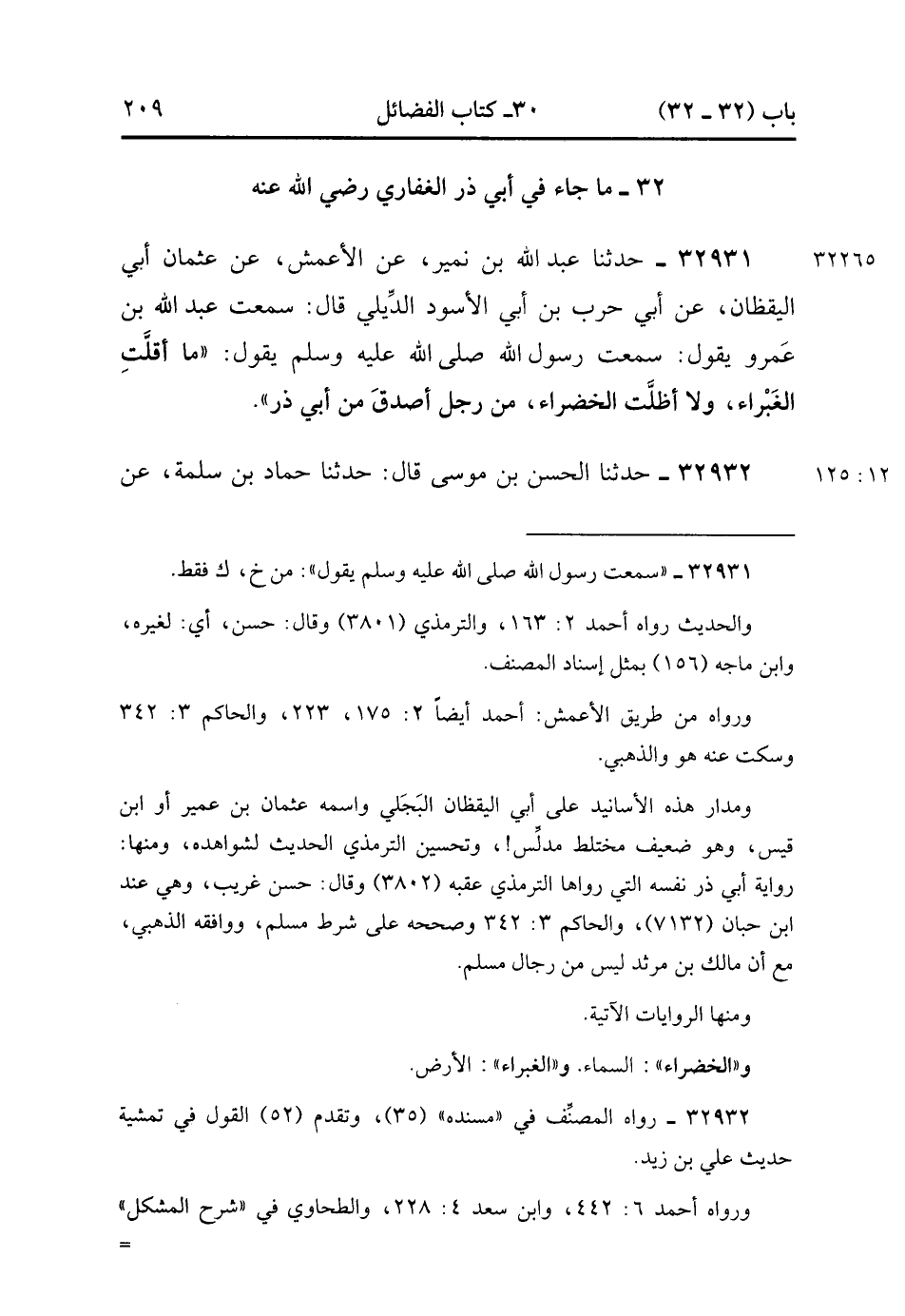 32931- حَدَّثَنَا عَبْدُ اللهِ بْنُ نُمَيْرٍ , عَنِ الأَعْمَشِ , عَنْ عُثْمَانَ أَبِي الْيَقْظَانِ , عَنْ أَبِي حَرْبِ بْنِ أَبِي الأَسْوَدِ الدَّيلِيِّ ، قَالَ : سَمِعْتُ عَبْدَ اللهِ بْنَ عَمْرٍو يقول : سَمِعْتُ رَسُولَ اللهِ يَقُولُ : مَا أَقَلَّتِ الْغَبْرَاءُ , وَلا أَظَلَّتِ الْخَضْرَاءُ مِنْ رَجُلٍ أَصْدَقَ مِنْ أَبِي ذَرٍّ.