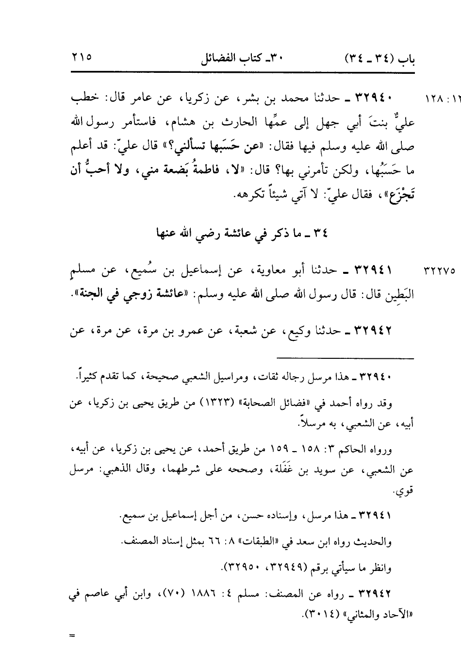 32941- حَدَّثَنَا أَبُو مُعَاوِيَةَ , عَنْ إسْمَاعِيلَ بْنِ سُمَيْعٍ , عَنْ مُسْلِمٍ الْبَطِينِ , قَالَ : قَالَ رَسُولُ اللهِ صَلَّى الله عَلَيْهِ وَسَلَّمَ : عَائِشَةُ زَوْجِي فِي الْجَنَّةِ. (12/128).