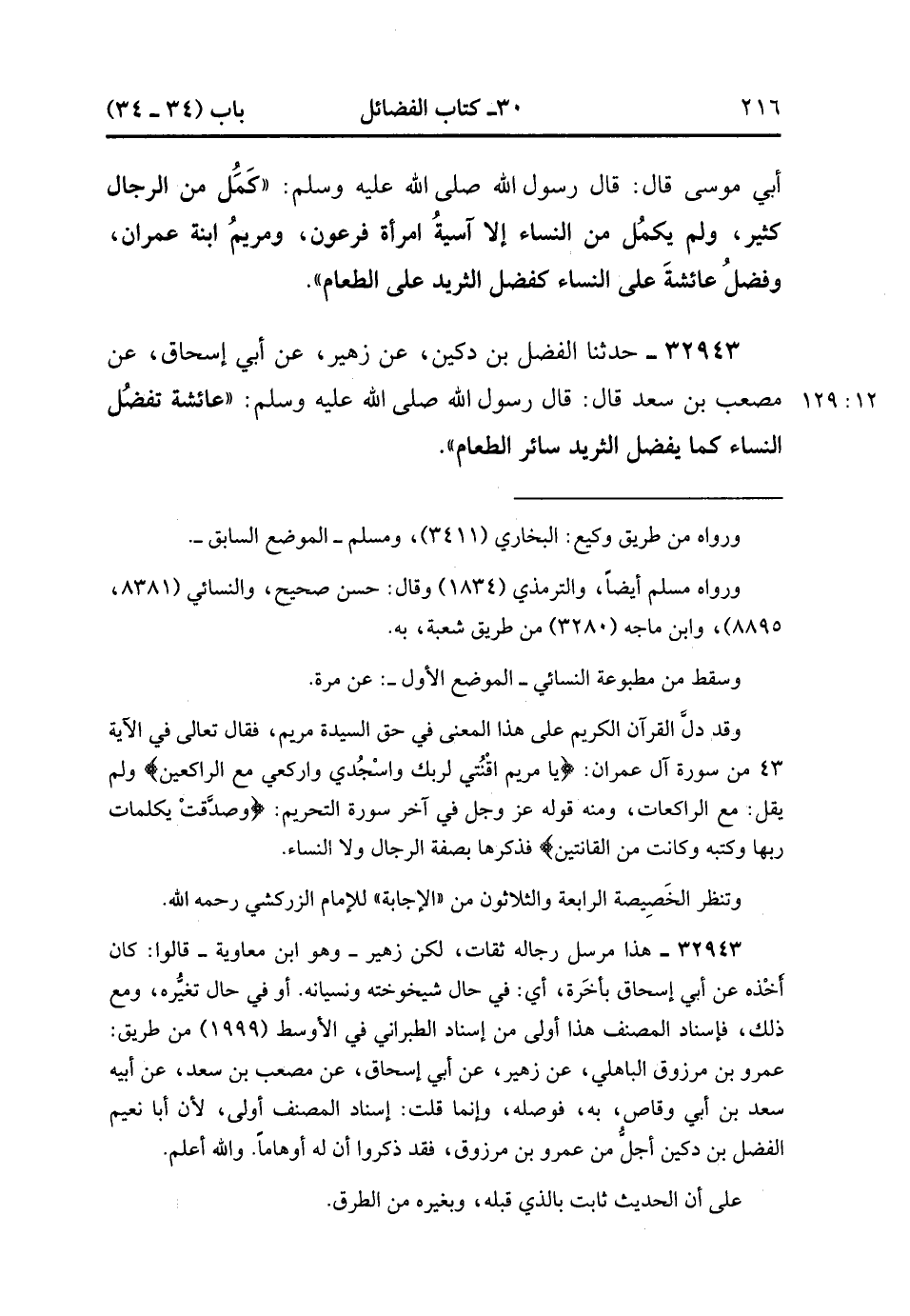 32943- حَدَّثَنَا الْفَضْلُ بْنُ دُكَيْنٍ , عَنْ زُهَيْرٍ , عَنْ أَبِي إِسْحَاقَ , عَنْ مُصْعَبِ بْنِ سَعْدٍ , قَالَ : قَالَ رَسُولُ اللهِ صَلَّى الله عَلَيْهِ وَسَلَّمَ : عَائِشَةُ تَفْضُلُ النِّسَاءَ كَمَا يُفَضَّلُ الثَّرِيدُ سَائِرِ الطَّعَامِ. (12/128).