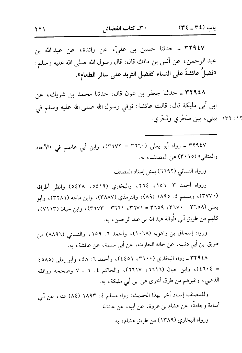 32947- حَدَّثَنَا حُسَيْنُ بْنُ عَلِيٍّ , عَنْ زَائِدَةَ , عَنْ عَبْدِ اللهِ بْنِ عَبْدِ الرَّحْمَنِ , عَنْ أَنَسٍ , قَالَ : قَالَ رَسُولُ اللهِ صَلَّى الله عَلَيْهِ وَسَلَّمَ : فَضْلُ عَائِشَةَ عَلَى النِّسَاءِ كَفَضْلِ الثَّرِيدِ عَلَى سَائِرِ الطَّعَامِ.
