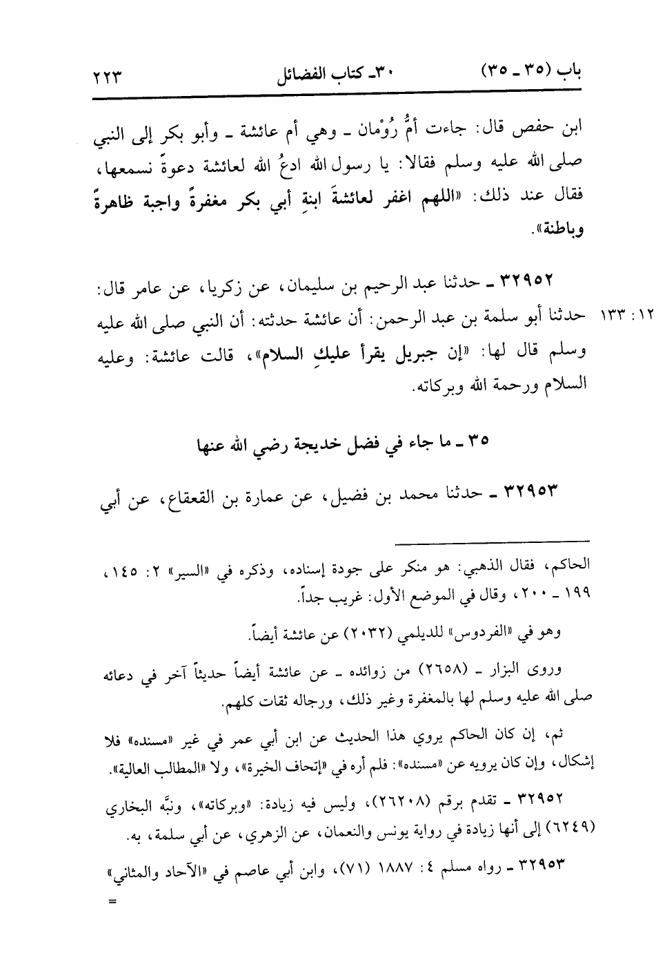 32952- حَدَّثَنَا عَبْدُ الرَّحِيمِ بْنُ سُلَيْمَانَ ، عَنْ زَكَرِيَّا ، عَنْ عَامِرٍ , قَالَ : حدَّثَنَا أَبُو سَلَمَةَ بْنُ عَبْدِ الرَّحْمَنِ أَنَّ عَائِشَةَ حَدَّثَتْهُ أَنَّ النَّبِيَّ صَلَّى الله عَلَيْهِ وَسَلَّمَ قَالَ لَهَا : إنَّ جِبْرِيلَ يَقْرَأُ عَلَيْك السَّلاَمَ ، قَالَتْ عَائِشَةُ : وَعَلَيْهِ السَّلاَمُ وَرَحْمَةُ اللهِ وَبَرَكَاتُهُ. (12/132).
