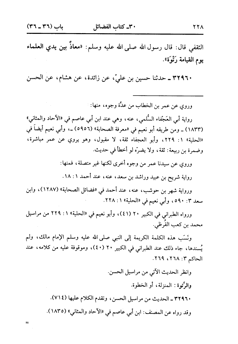 32960- حَدَّثَنَا حُسَيْنُ بْنُ عَلِيٍّ ، عَنْ زَائِدَةَ ، عَنْ هِشَامٍ ، عَنِ الْحَسَنِ ، قَالَ : قَالَ رَسُولُ اللهِ صَلَّى الله عَلَيْهِ وَسَلَّمَ : مُعَاذٌ بَيْنَ يَدَيَ الْعُلَمَاءِ يَوْمَ الْقِيَامَةِ نُبْذَةٌ. (12/135).