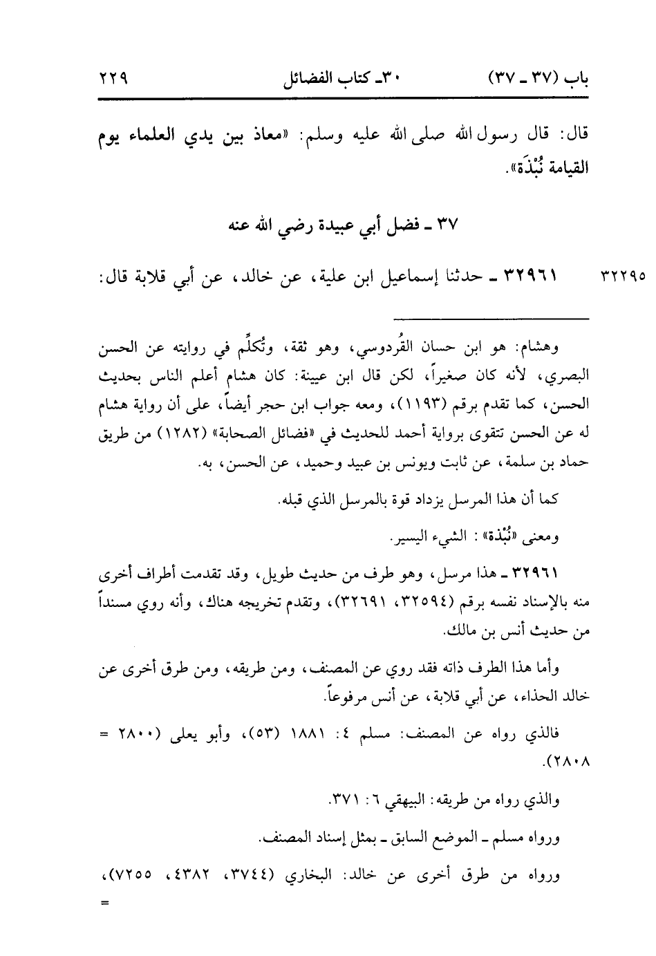 32961- حَدَّثَنَا إسْمَاعِيلُ ابْنُ عُلَيَّةَ ، عَنْ خَالِدٍ ، عَنْ أَبِي قِلاَبَةَ (1)، قَالَ : قَالَ رَسُولُ اللهِ صَلَّى الله عَلَيْهِ وَسَلَّمَ : إنَّ لِكُلِّ أُمَّةٍ أَمِينًا ، وَإِنَّ أَمِينَنَا أَيَّتُهَا الأُمَّةُ أَبُو عُبَيْدَةَ بْنُ الْجَرَّاحِ. (12/135).