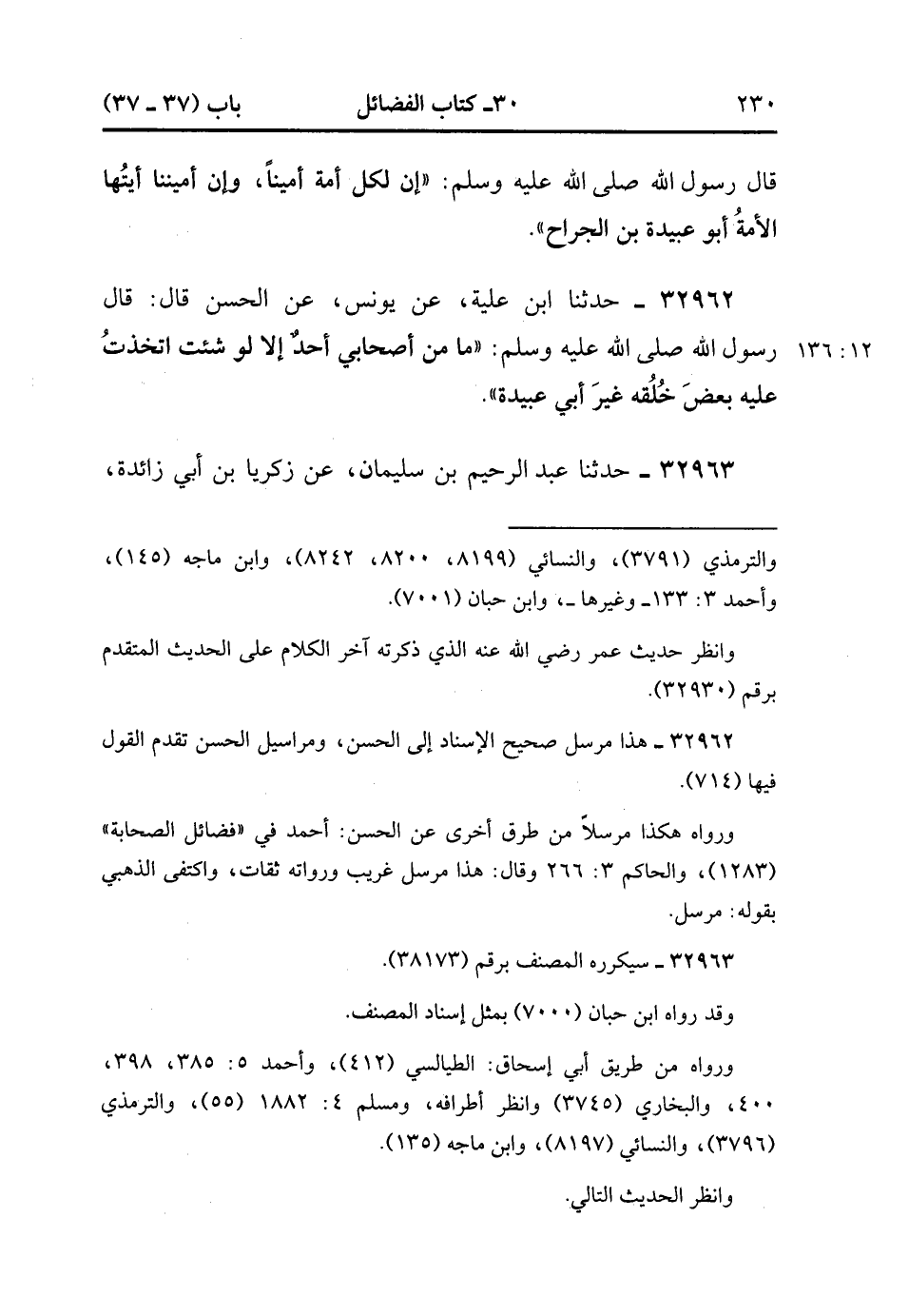 32963- حَدَّثَنَا عَبْدُ الرَّحِيمِ بْنُ سُلَيْمَانَ ، عَنْ زَكَرِيَّا بْنِ أَبِي زَائِدَةَ ، عَنْ أَبِي إِسْحَاقَ ، عَنْ صِلَةَ بْنِ زُفَرَ ، عَنْ حُذَيْفَةَ قَالَ : أَتَى النَّبِيَّ صَلَّى الله عَلَيْهِ وَسَلَّمَ أُسْقُفُ نَجْرَانَ الْعَاقِبُ وَالسَّيِّدُ فَقَالاَ : ابْعَثْ مَعَنَا رَجُلاً أَمِينًا حَقَّ أَمِينٍ , فَاسْتَشْرَفَ لَهَا أَصْحَابُ النَّبِيِّ صَلَّى الله عَلَيْهِ وَسَلَّمَ ، فَقَالَ : قُمْ يَا أَبَا عُبَيْدَةَ بْنَ الْجَرَّاحِ. (12/136).