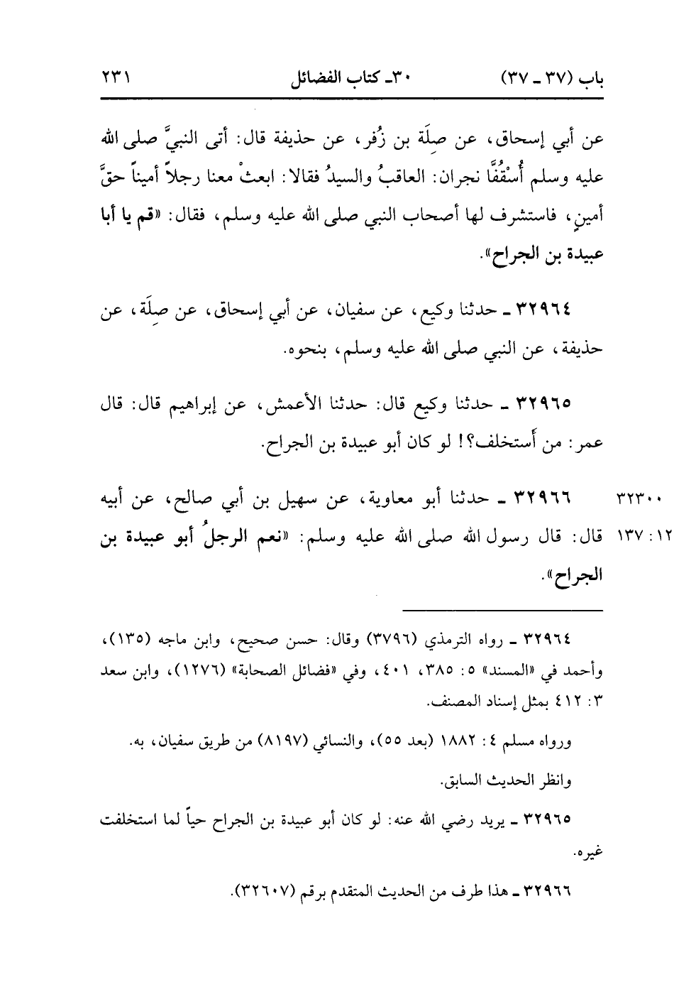 32966- حَدَّثَنَا أَبُو مُعَاوِيَةَ ، عَنْ سُهَيْلِ بْنِ أَبِي صَالِحٍ ، عَنْ أَبِيهِ ، قَالَ : قَالَ رَسُولُ اللهِ صَلَّى الله عَلَيْهِ وَسَلَّمَ : نِعْمَ الرَّجُلُ أَبُو عُبَيْدَةَ بْنُ الْجَرَّاحِ. (12/136).