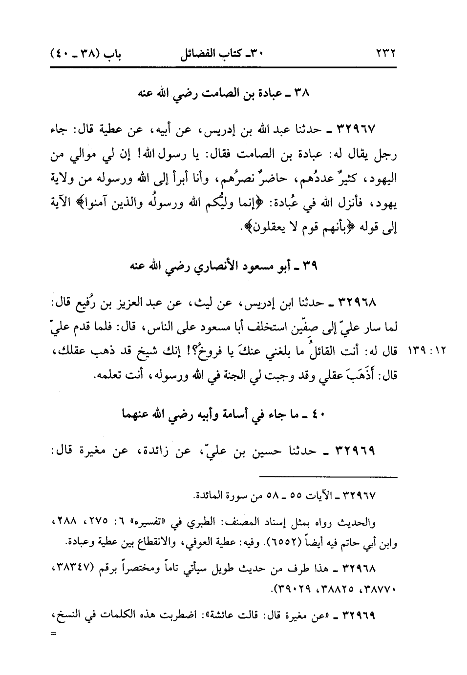 32967- حَدَّثَنَا عَبْدُ اللهِ بْنُ إدْرِيسَ ، عَنْ أَبِيهِ ، عَنْ عَطِيَّةَ ، قَالَ : جَاءَ رَجُلٌ يُقَالُ لَهُ عُبَادَةُ بْنُ الصَّامِتِ ، فَقَالَ : يَا رَسُولَ اللهِ إنَّ لِي مَوَالِيَ مِنَ الْيَهُودِ كَثِيرٌ عَدَدُهُمْ حاضر نصرهم , وَأَنَا أَبْرَأُ إلَى اللهِ وَرَسُولِهِ مِنْ وِلاَيَةِ يَهُودٍ , فَأَنْزَلَ اللَّهُ فِي عُبَادَةَ : {إنَّمَا وَلِيُّكُمُ اللَّهُ وَرَسُولُهُ وَالَّذِينَ آمَنُوا} الآيَةَ إلَى قَوْلِهِ : {بِأَنَّهُمْ قَوْمٌ لاَ يَعْقِلُونَ}.