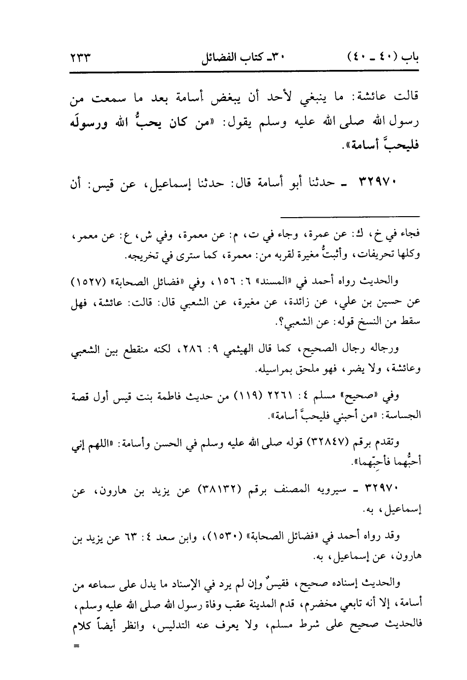 32969- حَدَّثَنَا حُسَيْنُ بْنُ عَلِيٍّ ، عَنْ زَائِدَةَ ، عَنْ مُغِيرَةَ ، عَنِ الشَّعْبِيِّ ، قَالَ : قالَتْ عَائِشَةُ (1) : مَا يَنْبَغِي لأَحَدٍ أَنْ يُبْغِضَ أُسَامَةَ بَعْدَ مَا سَمِعْت مِنْ رَسُولِ اللهِ صَلَّى الله عَلَيْهِ وَسَلَّمَ يَقُولُ : مَنْ كَانَ يُحِبُّ اللَّهَ وَرَسُولَهُ فَلْيُحِبَّ أُسَامَةَ. (12/138).