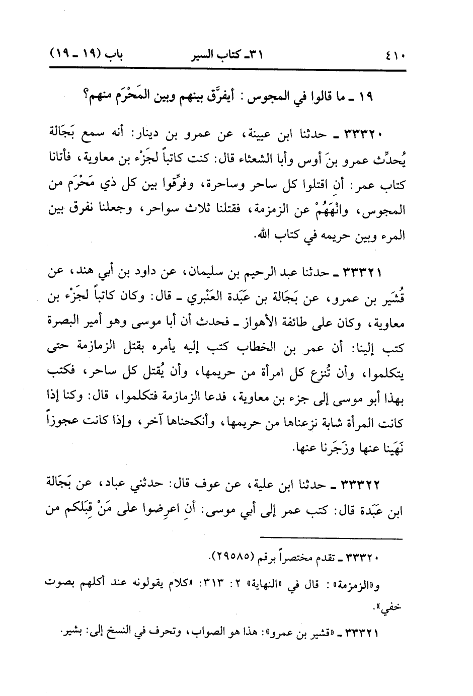 33320- حَدَّثَنَا ابْنُ عُيَيْنَةَ ، عَنْ عَمْرِو بْنِ دِينَارٍ أَنَّهُ سَمِعَ بَجَالَةَ يُحَدِّثُ عَمْرَو بْنَ أَوْسٍ وَأَبَا الشَّعْثَاءِ ، قَالَ : كُنْتُ كَاتِبًا لِجَزْءِ بْنِ مُعَاوِيَةَ : فَأَتَانَا كِتَابُ عُمَرَ أَنِ اقْتُلُوا كُلَّ سَاحِرٍ وَسَاحِرَةٍ , وَفَرِّقُوا بَيْنَ كُلِّ ذِي مَحْرَمٍ مِنَ الْمَجُوسِ , وَانْهَوْهُمْ ، عَنِ الزَّمْزَمَةِ فَقَتَلْنَا ثَلاَثَ سَوَاحِرَ , وَجَعَلْنَا نُفَرِّقُ بَيْنَ الْمَرْءِ وَبَيْنَ حَرِيمِهِ فِي كِتَابِ اللهِ.