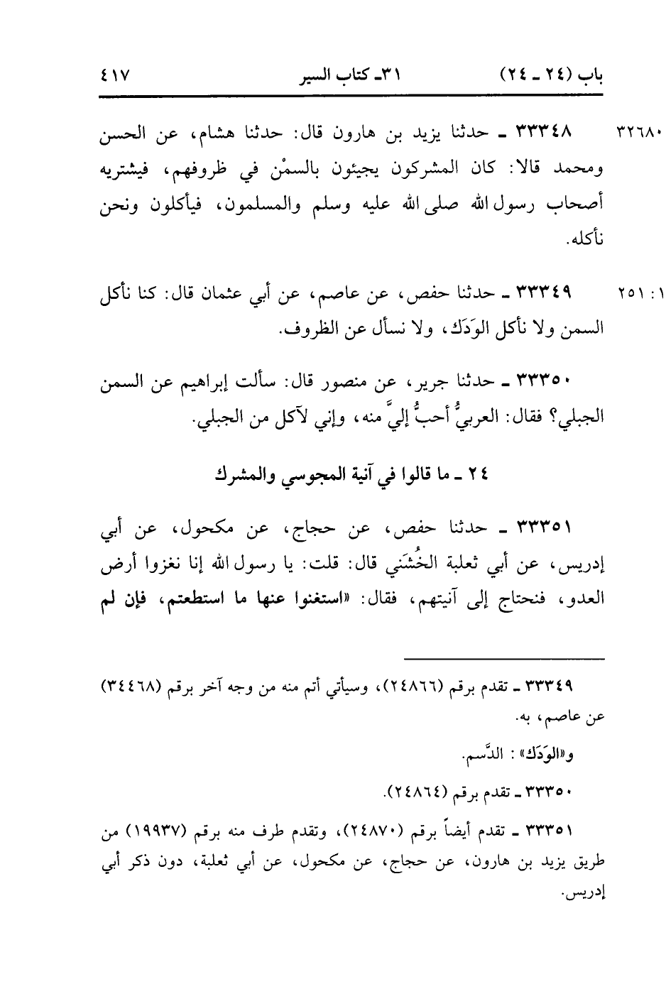 33351- حَدَّثَنَا حَفْصٌ ، عَنْ حَجَّاجٍ ، عَنْ مَكْحُولٍ ، عَنْ أَبِي إدْرِيسَ ، عَنْ أَبِي ثَعْلَبَةَ الْخُشَنِيِّ ، قَالَ : قلْت : يَا رَسُولَ اللهِ , إنَّا نَغْزُو أَرْضَ الْعَدُوِّ فَنَحْتَاجُ إلَى آنِيَتِهِمْ ، فَقَالَ : اسْتَغْنُوا عنها مَا اسْتَطَعْتُمْ , فَإِنْ لَمْ تَجِدُوا غَيْرَهَا فَاغْسِلُوهَا وَكُلُوا فِيهَا وَاشْرَبُوا. (12/251).