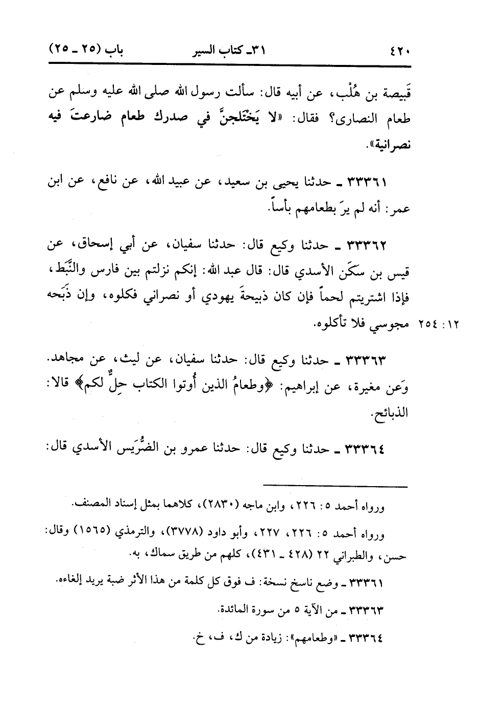 33362- حَدَّثَنَا وَكِيعٌ , قَالَ : حدَّثَنَا سُفْيَانُ ، عَنْ أَبِي إِسْحَاقَ ، عَنْ قَيْسِ بْنِ سَكَنٍ الأَسَدِيِّ ، قَالَ : قَالَ عَبْدُ اللهِ : إنَّكُمْ نَزَلْتُمْ بَيْنَ فَارِسَ وَالنَّبَطِ , فَإِذَا اشْتَرَيْتُمْ لَحْمًا , فَإِنْ كَانَ ذَبِيحَةَ يَهُودِيٍّ ، أَوْ نَصْرَانِيٍّ فَكُلُوهُ , وَإِنْ ذَبَحَهُ مَجُوسِيٌّ فَلاَ تَأْكُلُوهُ. (12/253).
