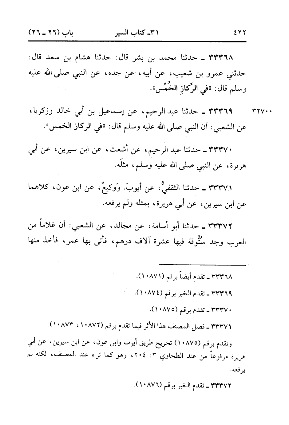 33372- حَدَّثَنَا أَبُو أُسَامَةَ ، عَنْ مُجَالِدٍ ، عَنِ الشَّعْبِيِّ أَنَّ غُلاَمًا مِنَ الْعَرَبِ وَجَدَ سَتُّوقَةً فِيهَا عَشْرَةُ آلاَفِ دِرْهَمٍ , فَأَتَى بِهَا عُمَرَ فَأَخَذَ مِنْهَا خُمُسَهَا أَلْفَيْنِ وَأَعْطَاهُ ثَمَانيَةَ آلاَفٍ. (12/255).