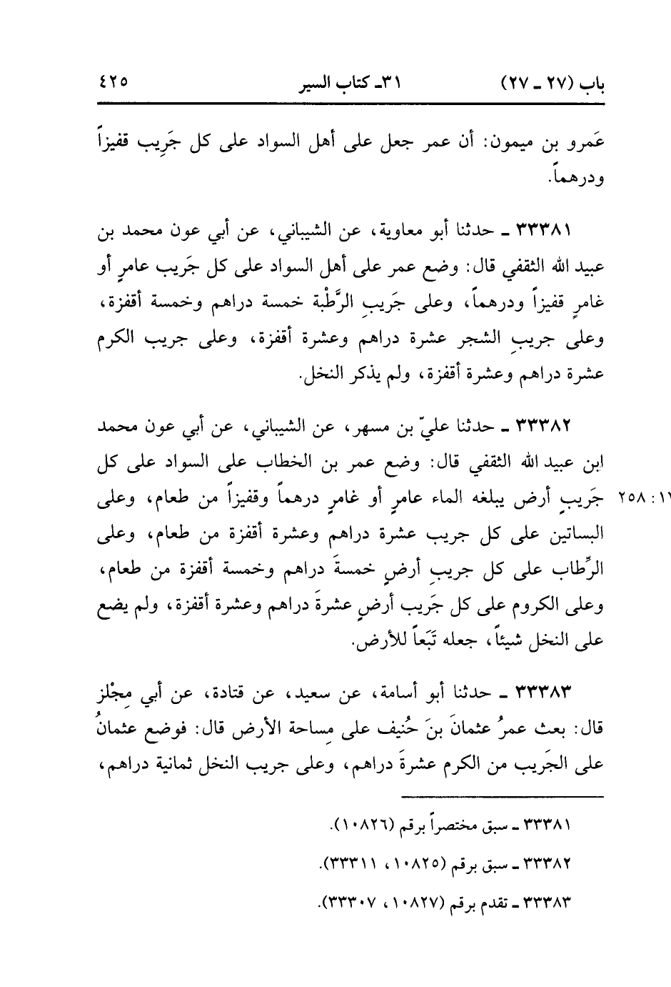 33381- حَدَّثَنَا أَبُو مُعَاوِيَةَ ، عَنِ الشَّيْبَانِيِّ ، عَنْ أَبِي عَوْنٍ مُحَمَّدِ بْنِ عُبَيْدِ اللهِ الثَّقَفِيِّ ، قَالَ : وَضَعَ عُمَرُ عَلَى أَهْلِ السَّوَادِ عَلَى كُلِّ جَرِيبٍ عَامِرٍ ، أَوْ غَامِرٍ قَفِيزًا وَدِرْهَمًا , وَعَلَى جَرِيبِ الرُّطَبَةِ خَمْسَةَ دَرَاهِمَ وَخَمْسَةَ أَقْفِزَةٍ , وَعَلَى جَرِيبِ الشَّجَرِ عَشَرَةَ دَرَاهِمَ وَعَشْرَةَ أَقْفِزَةٍ , وَعَلَى جَرِيبِ الْكَرْمِ عَشَرَةَ دَرَاهِمَ وَعَشْرَةَ أَقْفِزَةٍ , وَلَمْ يَذْكُرِ النَّخْلَ.
