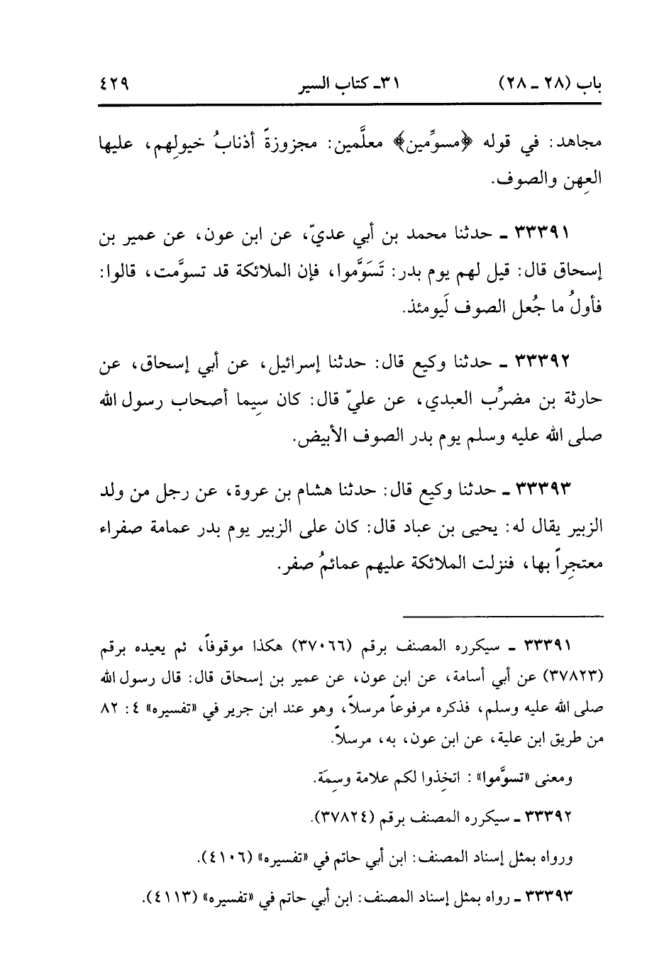 33391- حَدَّثَنَا مُحَمَّدُ بْنُ أَبِي عَدِيٍّ ، عَنِ ابْنِ عَوْنٍ ، عَنْ عُمَيْرِ بْنِ إِسْحَاقَ ، قَالَ : قيلَ لَهُمْ يَوْمَ بَدْرٍ تَسَوَّمُوا فَإِنَّ الْمَلاَئِكَةَ قَدْ تَسَوَّمَتْ ، قَالُوا : فَأَوَّلُ مَا جُعِلَ الصُّوفُ لَيَوْمَئِذٍ.