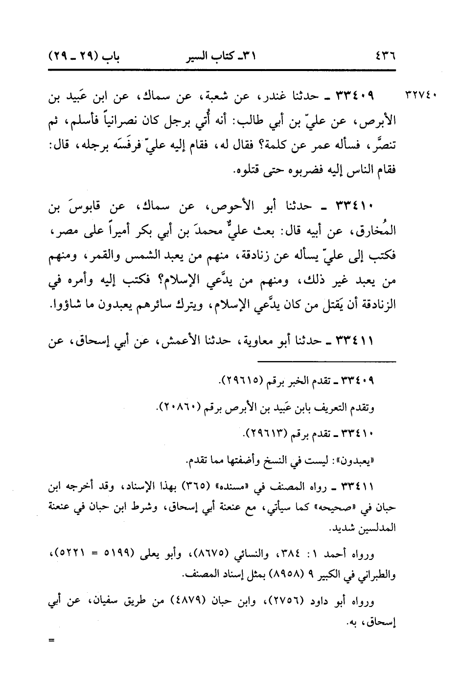 33410- حَدَّثَنَا أَبُو الأَحْوَصِِ ، عَنْ سِمَاكٍ ، عَنْ قَابُوسَ بْنِ الْمُخَارِقِ ، عَنْ أَبِيهِ ، قَالَ : بَعَثَ عَلِيٌّ مُحَمَّدَ بْنَ أَبِي بَكْرٍ أَمِيرًا عَلَى مِصْرَ فَكَتَبَ إلَى عَلِيٍّ يَسْأَلُهُ عَنْ زَنَادِقَةٍ , مِنْهُمْ مَنْ يَعْبُدُ الشَّمْسَ وَالْقَمَرَ , وَمِنْهُمْ مَنْ يَعْبُدُ غَيْرَ ذَلِكَ وَمِنْهُمْ مَنْ يَدَّعِي الإِسْلاَمَ فَكَتَبَ إلَيْهِ وَأَمَرَهُ فِي الزَّنَادِقَةِ أَنْ يَقْتُلَ مَنْ كَانَ يَدَّعِي الإِسْلاَمَ , وَيَتْرُكَ سَائِرَهُمْ يَعْبُدُونَ مَا شَاؤُوا. (12/268).