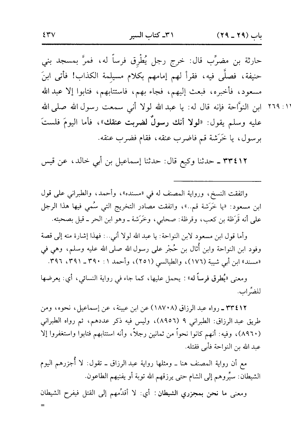 33411- حَدَّثَنَا أَبُو مُعَاوِيَةَ ، حَدَّثَنَا الأَعْمَشُ ، عَنْ أَبِي إِسْحَاقَ ، عَنْ حَارِثَةَ بْنِ مُضَرِّبٍ ، قَالَ : خَرَجَ رَجُلٌ يَطْرُقُ فَرَسًا لَهُ فَمَرَّ بِمَسْجِدِ بَنِي حَنِيفَةَ فَصَلَّى فِيهِ فَقَرَأَ لَهُمْ إمَامُهُمْ بِكَلاَمِ مُسَيْلِمَةَ الْكَذَّابِ , فَأَتَى ابْنُ مَسْعُودٍ فَأَخْبَرَهُ فَبَعَثَ إلَيْهِمْ فَجَاءَ بِهِمْ , فَاسْتَتَابَهُمْ فَتَابُوا إِلاَّ عَبْدَ اللهِ ابْنَ النَّوَّاحَةِ فَأَنَّهُ قَالَ لَهُ : يَا عَبْدَ اللهِ لولا أَنِّي سَمِعْتُ رَسُولَ اللهِ صَلَّى الله عَلَيْهِ وَسَلَّمَ يَقُولُ : لَوْلاَ أَنَّكَ رَسُولٌ لَضَرَبْت عُنُقَك , فَأَمَّا الْيَوْمَ فَلَسْت بِرَسُولٍ , يَا خَرَشَةُ قُمْ فَاضْرِبْ عُنُقَهُ فَقَامَ فَضَرَبَ عُنُقَهُ. (12/268).