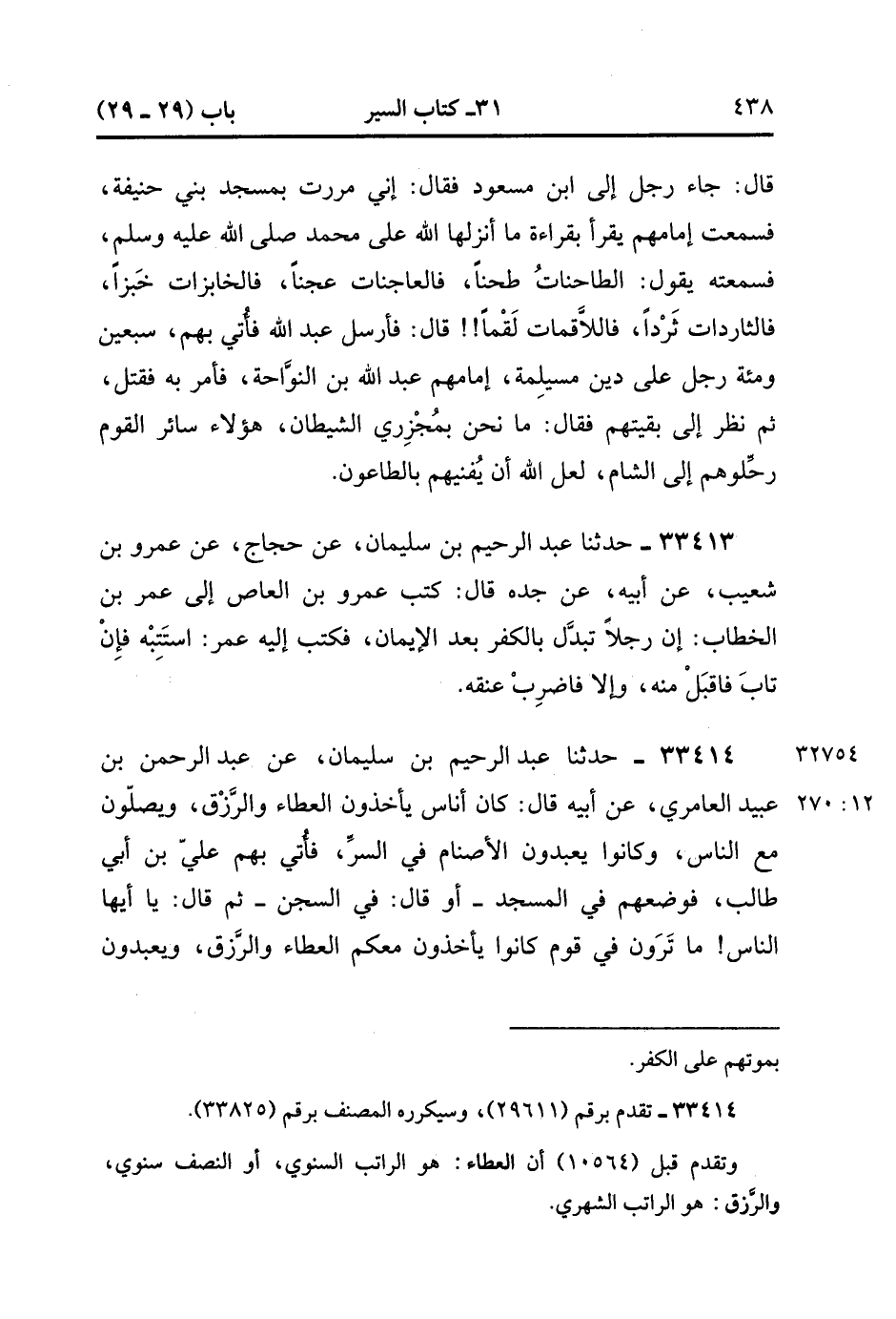 33413- حَدَّثَنَا عَبْدُ الرَّحِيمِ بْنُ سُلَيْمَانَ ، عَنْ حَجَّاجٍ ، عَنْ عَمْرِو بْنِ شُعَيْبٍ ، عَنْ أَبِيهِ ، عَنْ جَدِّهِ ، قَالَ : كَتَبَ عَمْرُو بْنُ الْعَاصِ إلَى عُمَرَ بْنِ الْخَطَّابِ أَنَّ رَجُلاً تَبَدَّلَ بِالْكُفْرِ بَعْدَ الإِيمَانِ , فَكَتَبَ إلَيْهِ عُمَرُ : اسْتَتِبْهُ , فَإِنْ تَابَ فَاقْبَلْ مِنْهُ , وَإِلاَّ فَاضْرِبْ عُنُقَهُ. (12/269).