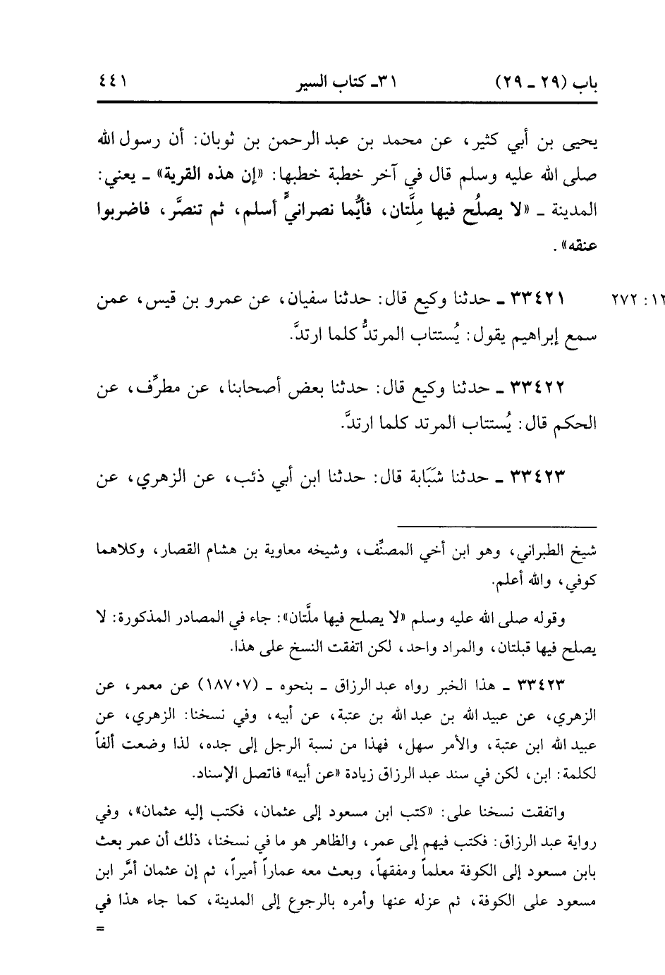 33423- حَدَّثَنَا شَبَابَةُ , قَالَ : حدَّثَنَا ابْنُ أَبِي ذِئْبٍ ، عَنِ الزُّهْرِيِّ ، عَنْ عُبَيْدِ اللهِ ابْنِ عُتْبَةَ ، قَالَ : كَانَ نَاسٌ مِنْ بَنِي حَنِيفَةَ مِمَّنْ كَانَ مَعَ مُسَيْلِمَةَ الْكَذَّابِ يُفْشُونَ أَحَادِيثَهُ وَيَتْلُونَهُ فَأَخَذَهُمَ ابْنُ مَسْعُودٍ فكتب ابن مسعود إلَى عُثْمَانَ فَكَتَبَ إلَيْهِ عُثْمَان أَنِ ادْعُهُمْ إلَى الإِسْلاَمِ فَمَنْ شَهِدَ مِنْهُمْ أَنْ لاَ إلَهَ إِلاَّ اللَّهُ وَأَنَّ مُحَمَّدًا رَسُولُ اللهِ صَلَّى الله عَلَيْهِ وَسَلَّمَ وَاخْتَارَ الإِيمَانَ عَلَى الْكُفْرِ فَاقْبَلْ ذَلِكَ مِنْهُمْ وَخَلِّ سَبِيلَهُمْ , فَإِنْ أَبَوْا فَاضْرِبْ أَعْنَاقَهُمْ , فَاسْتَتَابَهُمْ , فَتَابَ بَعْضُهُمْ وَأَبَى بَعْضُهُمْ , فَضَرَبَ أَعْنَاقَ الَّذِينَ أَبَوْا. (12/272).